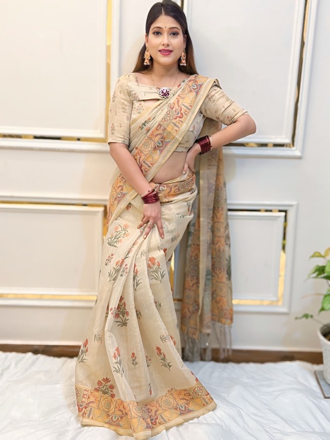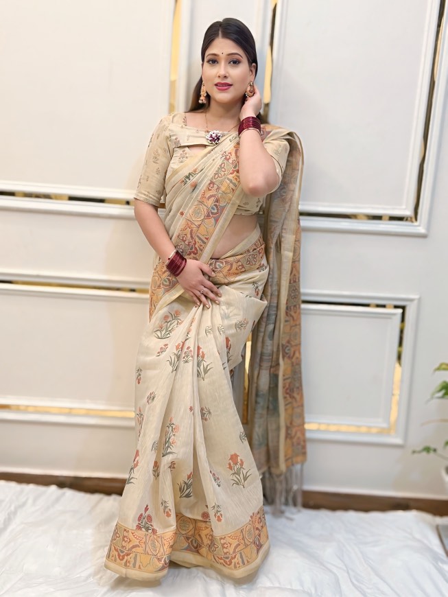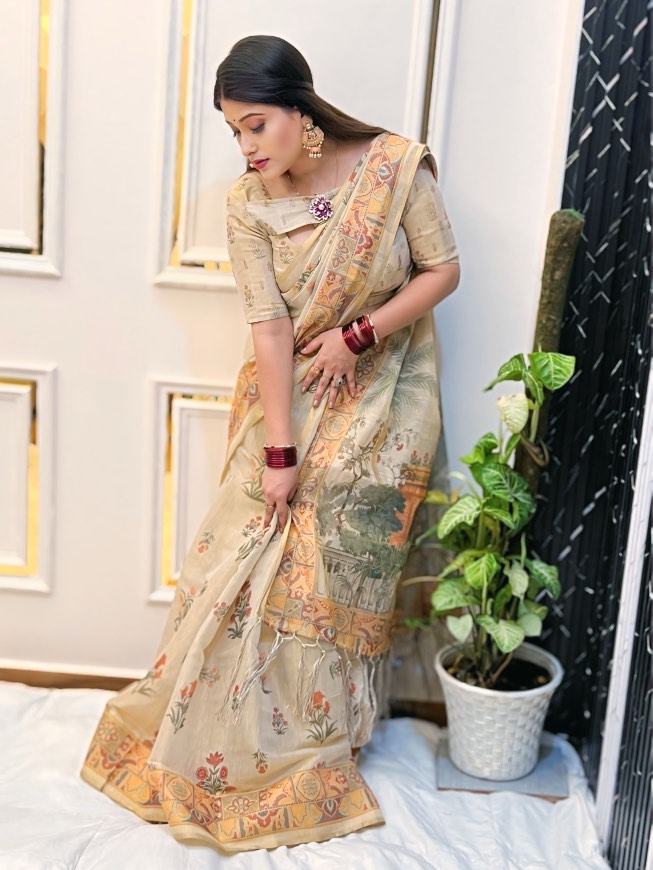 Beige Floral Print Tissue zari Saree with Traditional Village Artwork – Elegant Ethnic Wear for Women