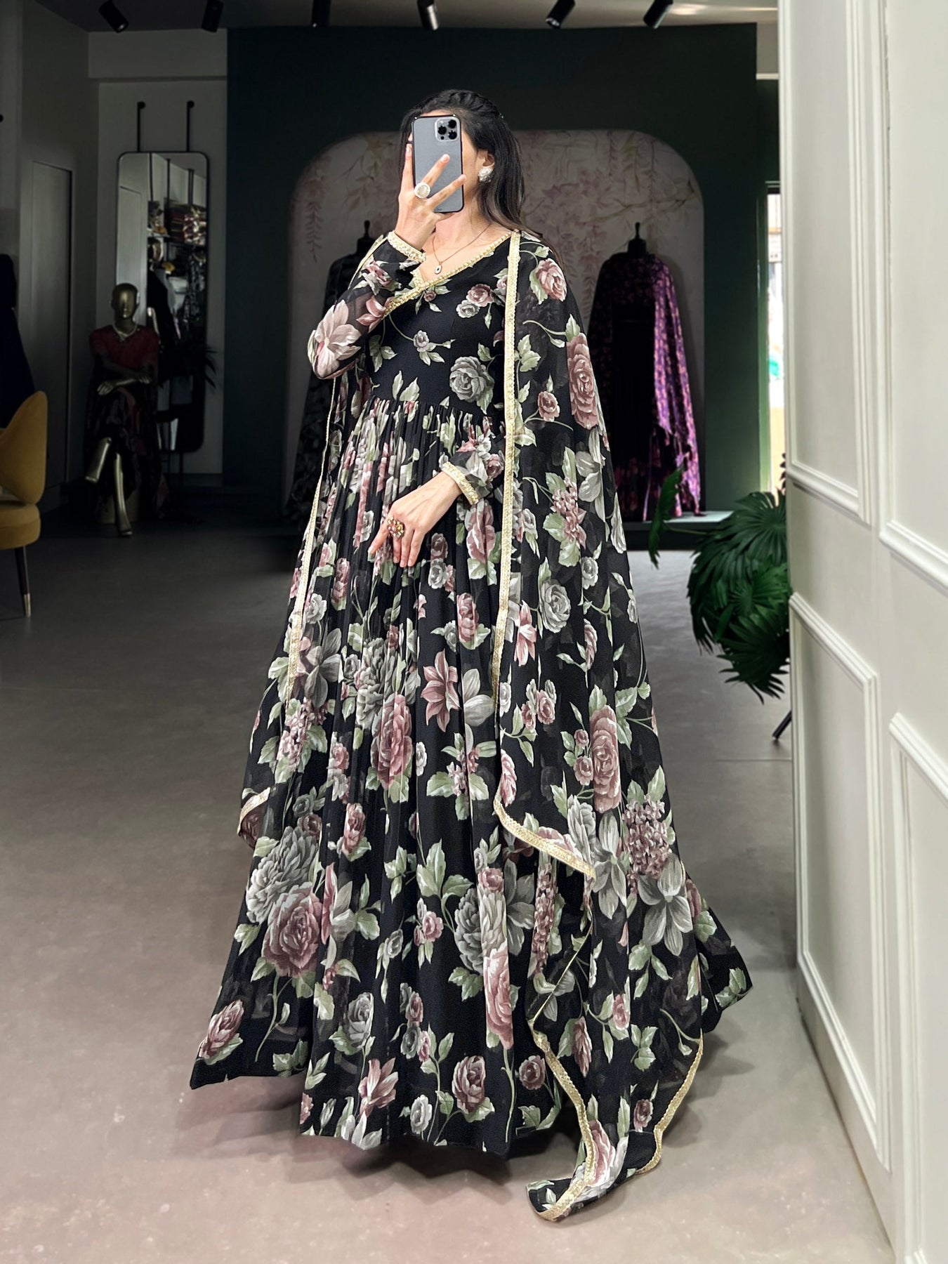 ✔ Fabric: Premium Marble Fabric ✔ Color: Classic Black with Romantic Floral Print ✔ Work: Floral Print with Lace Touch-Up ✔ Chest Size: 42 (XL) (Supports up to 44 inches for a comfortable fit) ✔ Waist Size: 38 inches ✔ Shoulder: 15 inches ✔ Sleeve Length: 30 inches ✔ Length: 50 inches ✔ Flair: 3.5 meters for a flowy and elegant silhouette ✔ Lining: Soft Cotton (Fully lined up to the bottom for all-day comfort)