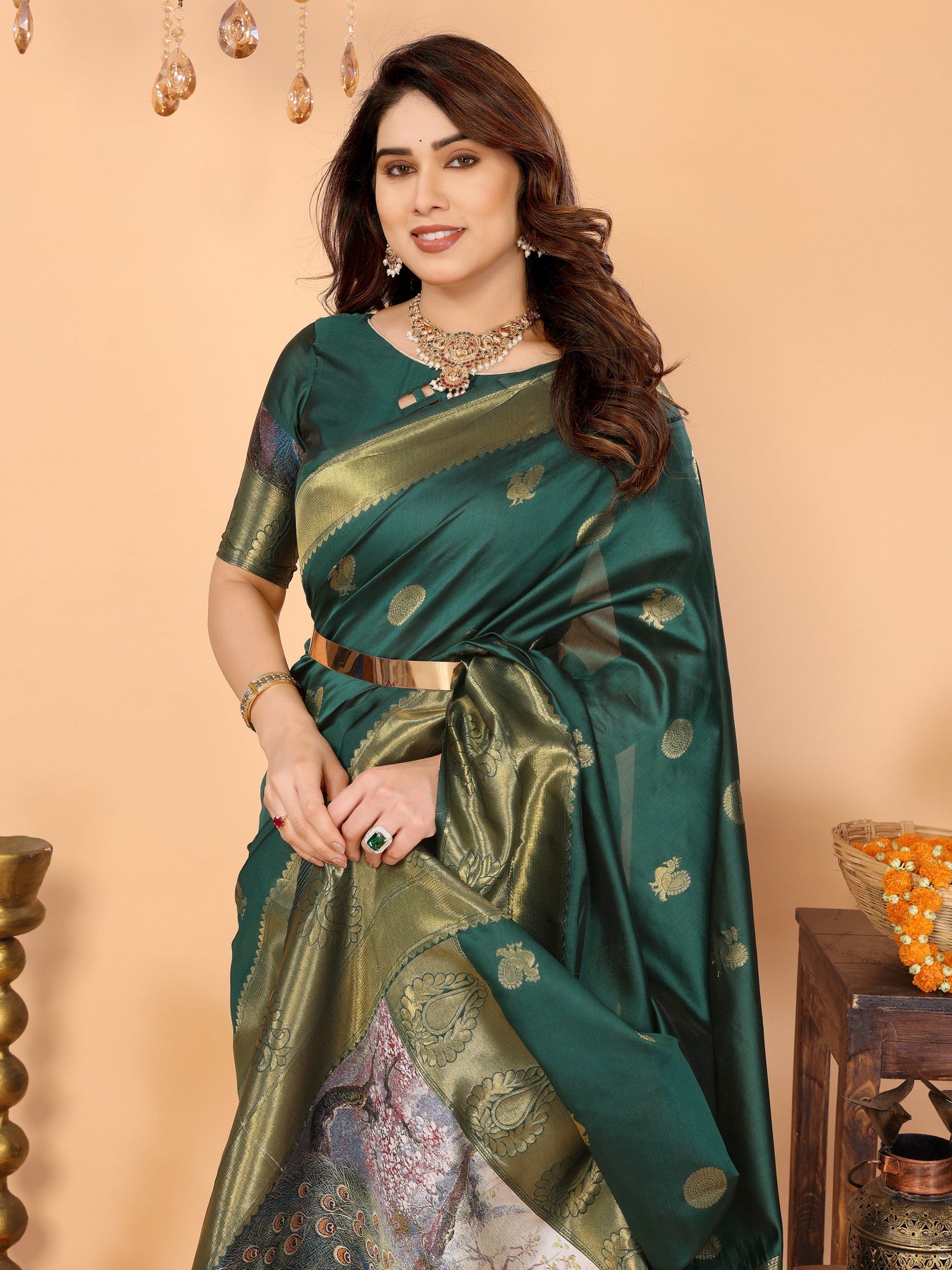 Step into timeless elegance with this gorgeous Bottle Green Banarasi Silk Saree, a perfect blend of heritage and sophistication. Crafted from premium silk, the saree features rich golden zari motifs that beautifully contrast the deep green tone, offering a luxurious finish.