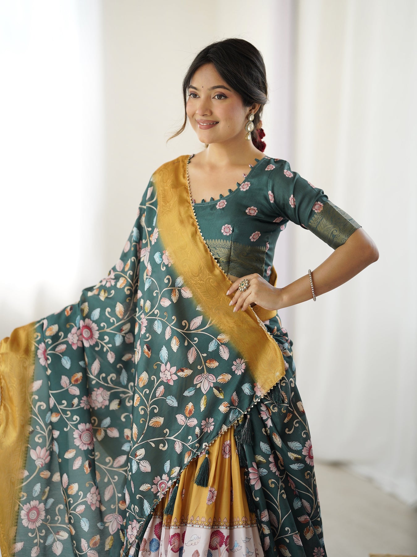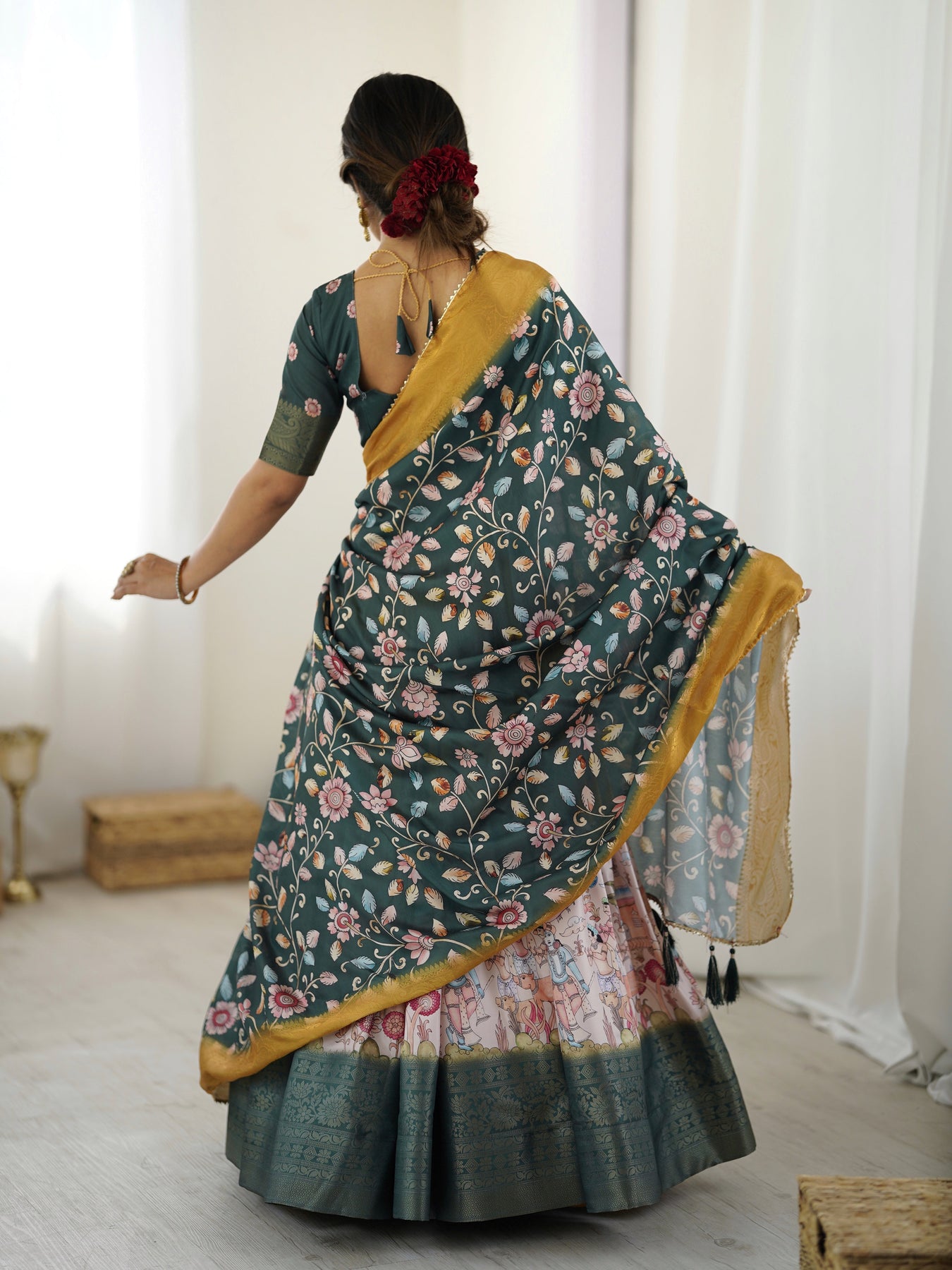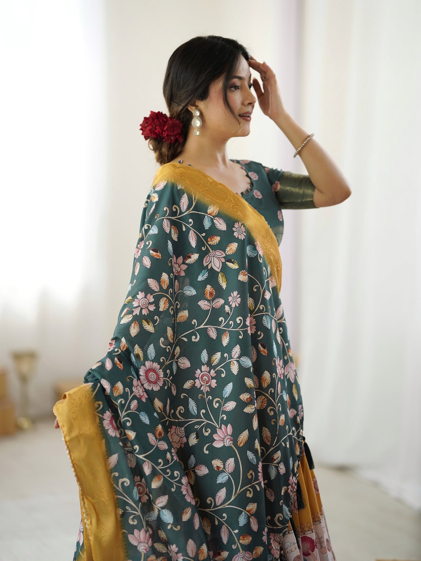 The deep bottle green combined with mustard creates a rich, earthy palette perfect for festive and traditional wear. The elaborate kalamkari border paired with a floral dupatta showcases craftsmanship and cultural richness in one elegant outfit — a timeless treasure for your ethnic wardrobe.