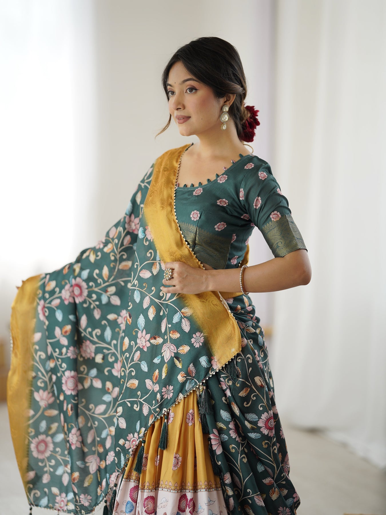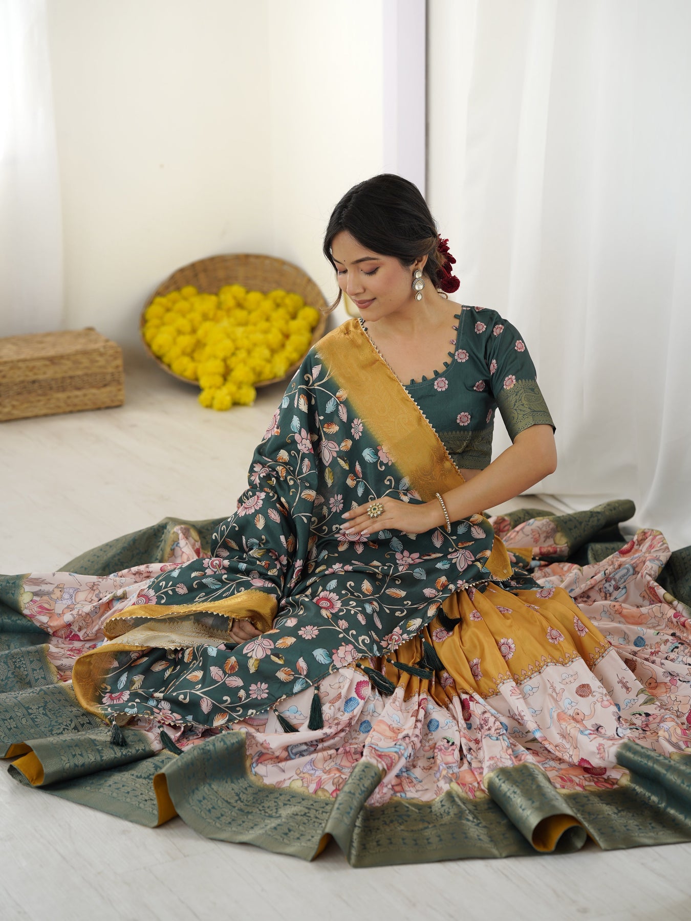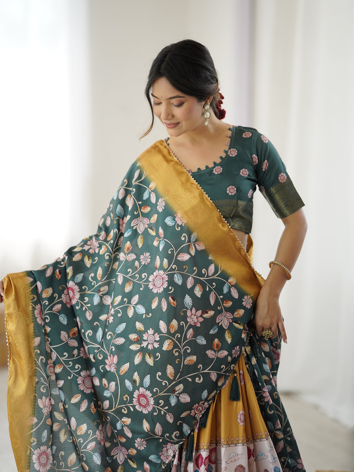 The deep bottle green combined with mustard creates a rich, earthy palette perfect for festive and traditional wear. The elaborate kalamkari border paired with a floral dupatta showcases craftsmanship and cultural richness in one elegant outfit — a timeless treasure for your ethnic wardrobe.