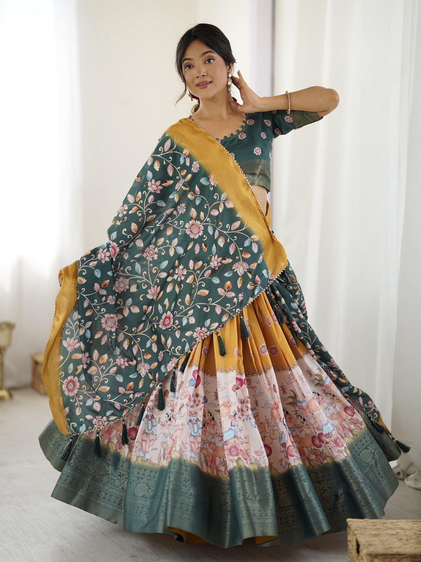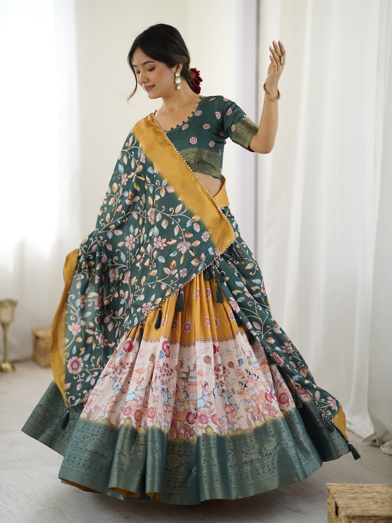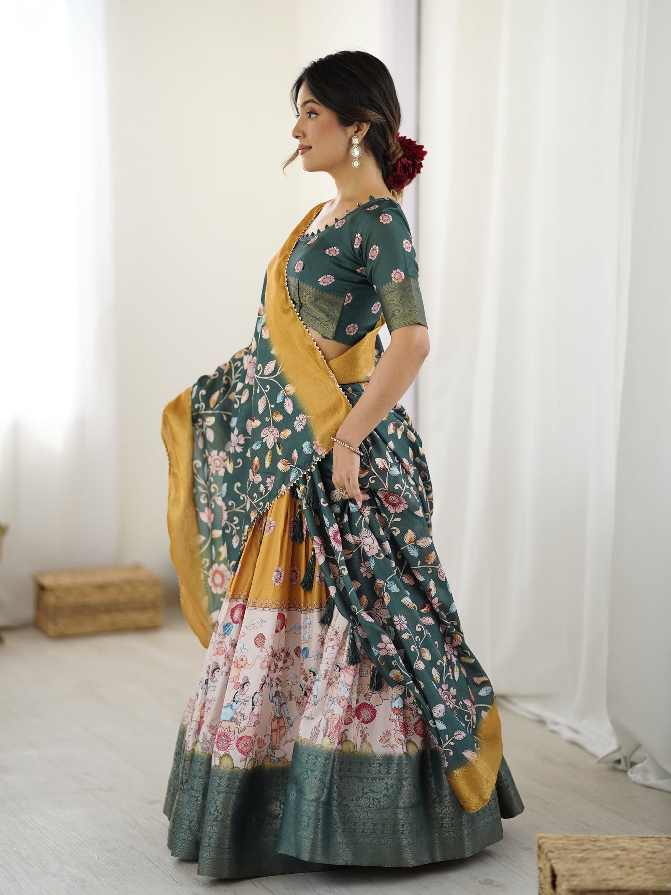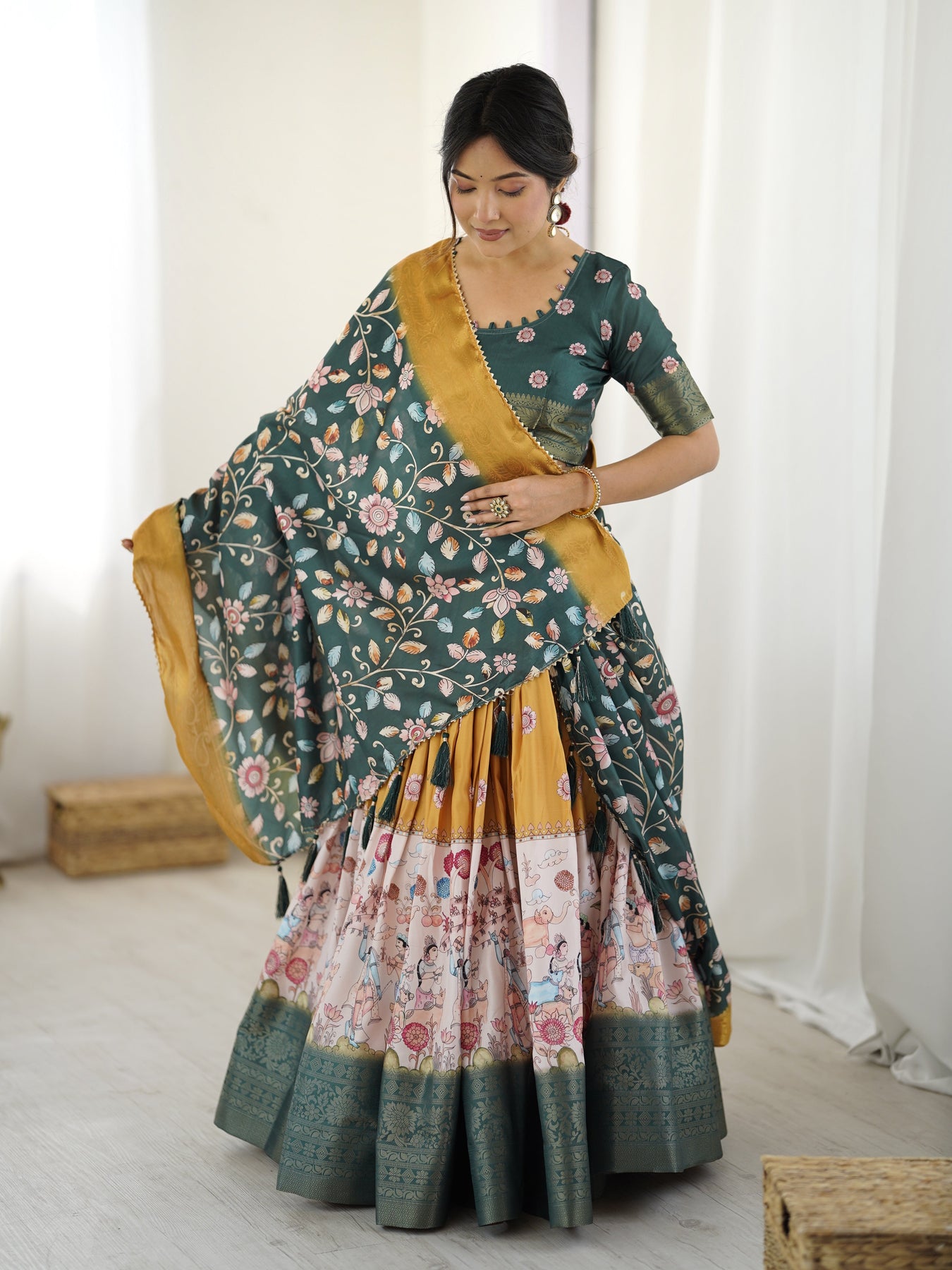 Step into timeless tradition with this Bottle Green Kalamkari Lehenga, designed to celebrate Indian art and elegance. Featuring exquisite kalamkari-style storytelling on the skirt, this lehenga is paired with a striking mustard and green floral dupatta, woven with intricate detailing and a soft golden border that adds regal charm.
