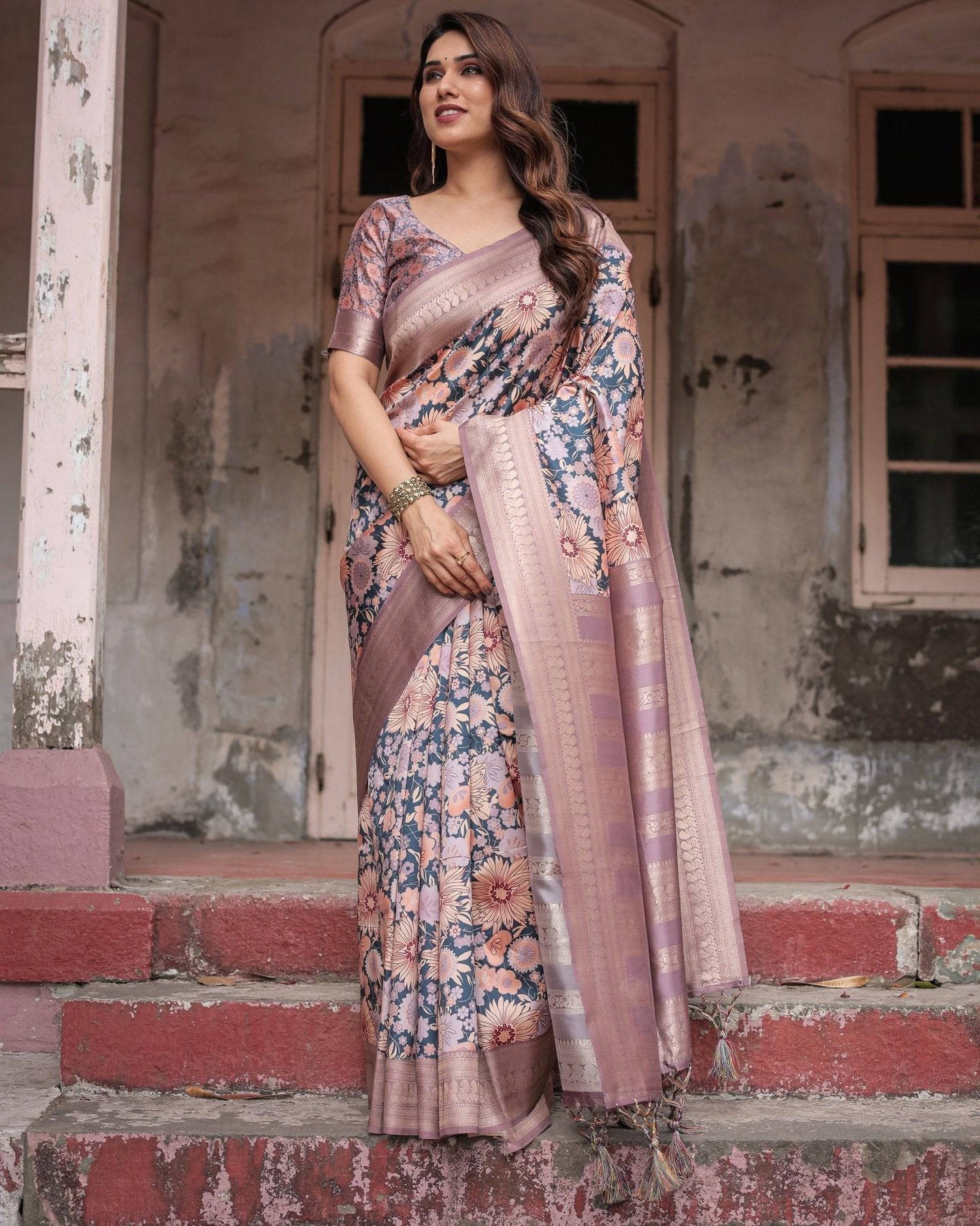 Drape yourself in sophistication with this exquisite lilac and peach Banarasi silk saree. Adorned with vibrant floral digital prints, this saree captures the essence of feminine grace and charm. The intricate zari border, complete with delicate tassels, adds a touch of luxury, making it perfect for weddings, festive celebrations, or formal events.