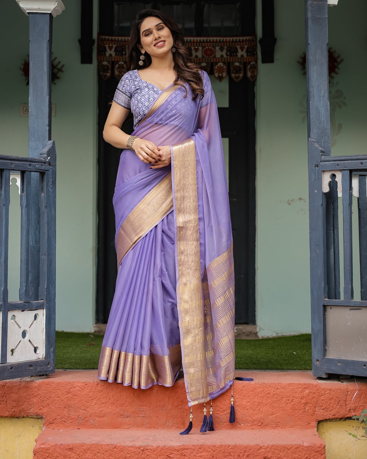 Paired with a geometric-printed blouse in matching lavender and white tones, this ensemble creates a harmonious and chic look. The saree is further accentuated with tassel detailing on the pallu edges, adding a playful yet refined finish.