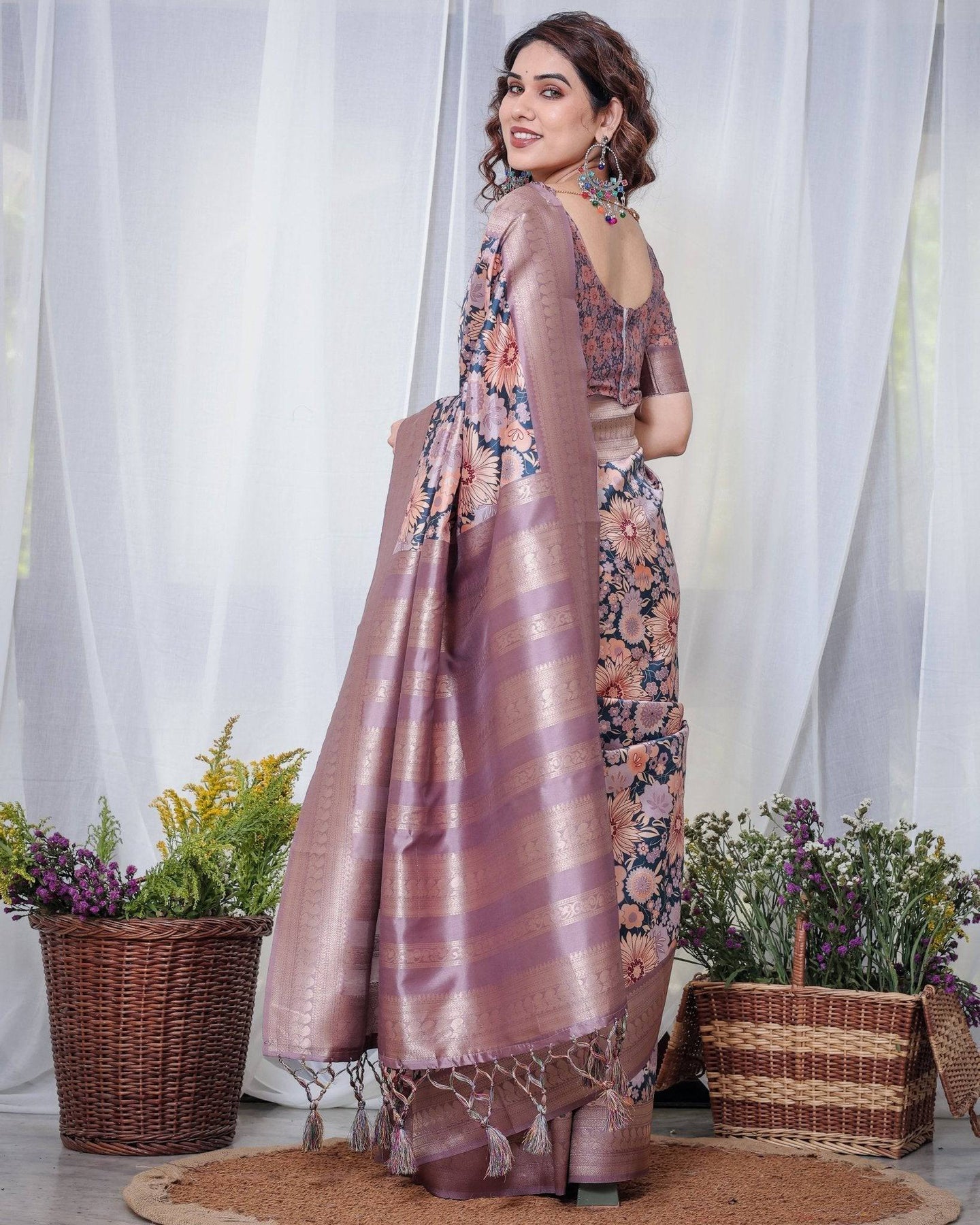 Elevate your ethnic wardrobe with this enchanting lilac Banarasi silk saree, adorned with a graceful pastel floral digital print. The saree is beautifully accented with a luxurious zari-woven border and a tassel-adorned pallu, showcasing timeless craftsmanship with a modern twist. Ideal for weddings, festive gatherings, or special occasions, this saree exudes elegance and sophistication. The premium silk fabric offers a flawless drape and unmatched comfort, making it perfect for all-day wear. Pair it with pearl jewelry or statement earrings for a look that blends tradition and contemporary charm.
