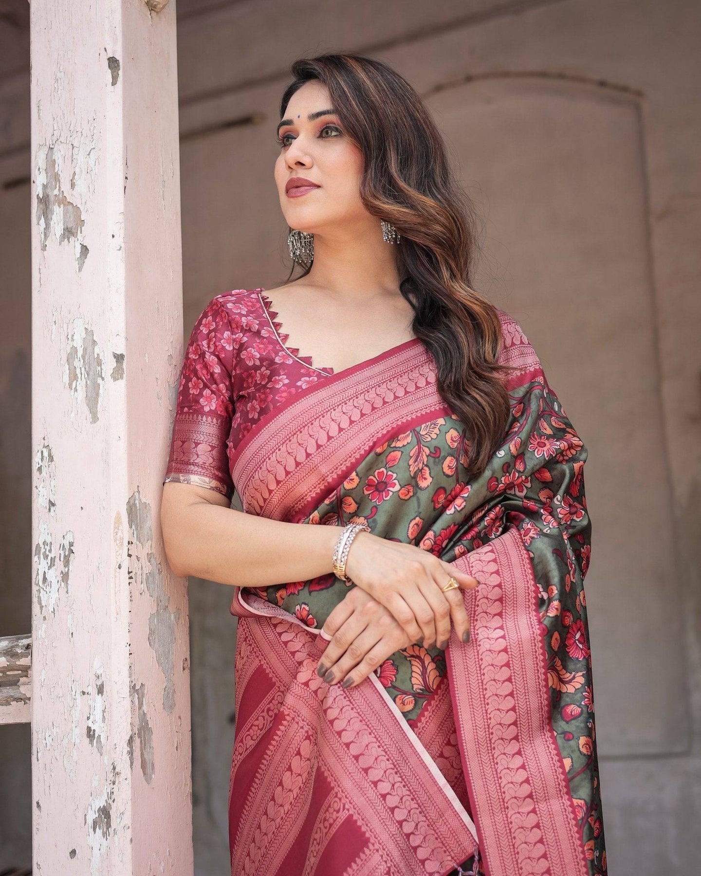 Experience the elegance of tradition with this green Banarasi silk saree featuring vibrant floral motifs and an exquisite pink zari border. This timeless piece comes with meticulously handcrafted tassels, adding a touch of grace to the overall design. Perfect for weddings, festive occasions, and cultural celebrations, this saree is a must-have for those who cherish the beauty of Indian ethnic wear.