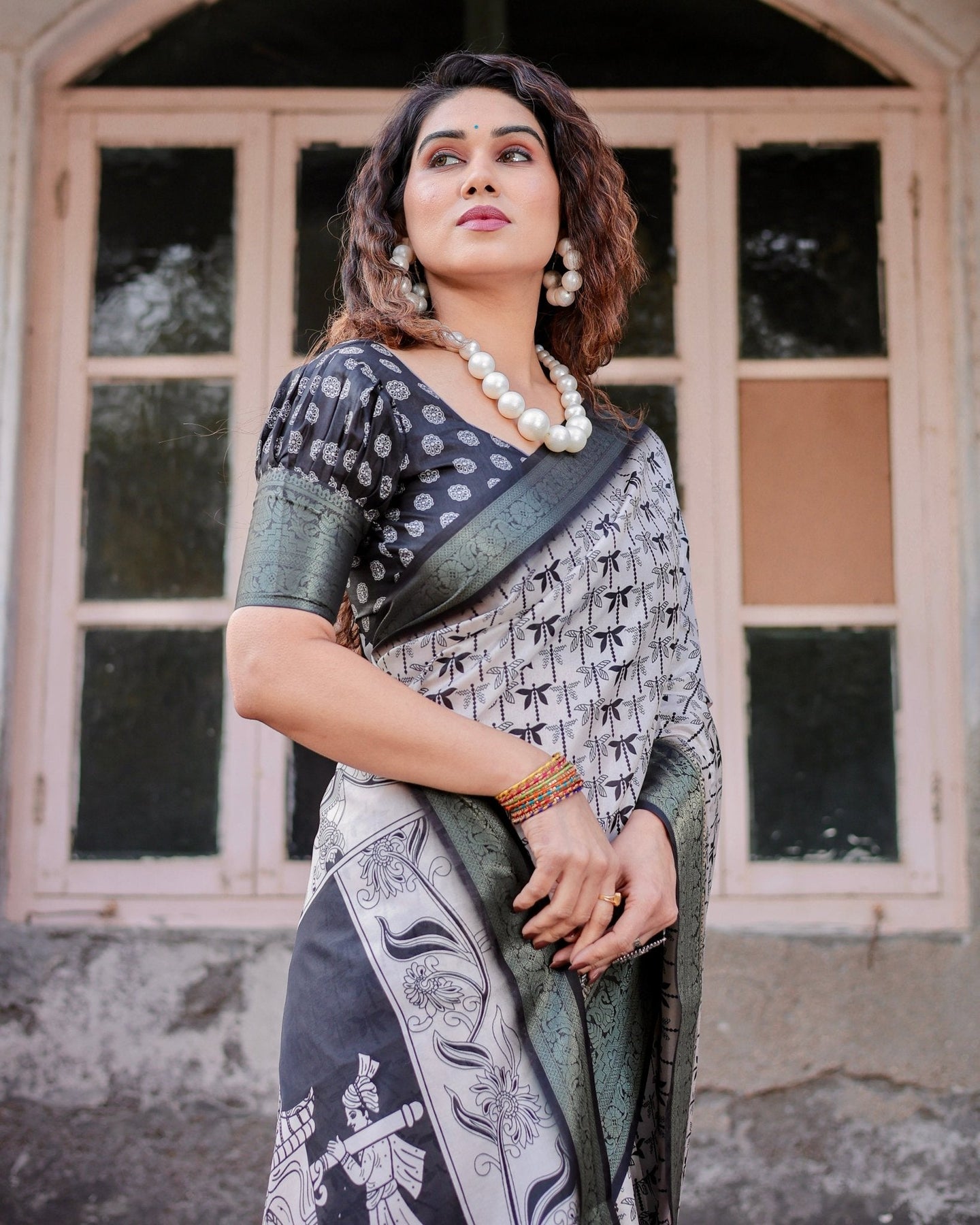 Monochrome White and Black Tussar Silk Saree with Tribal Art Motifs and Zari Border