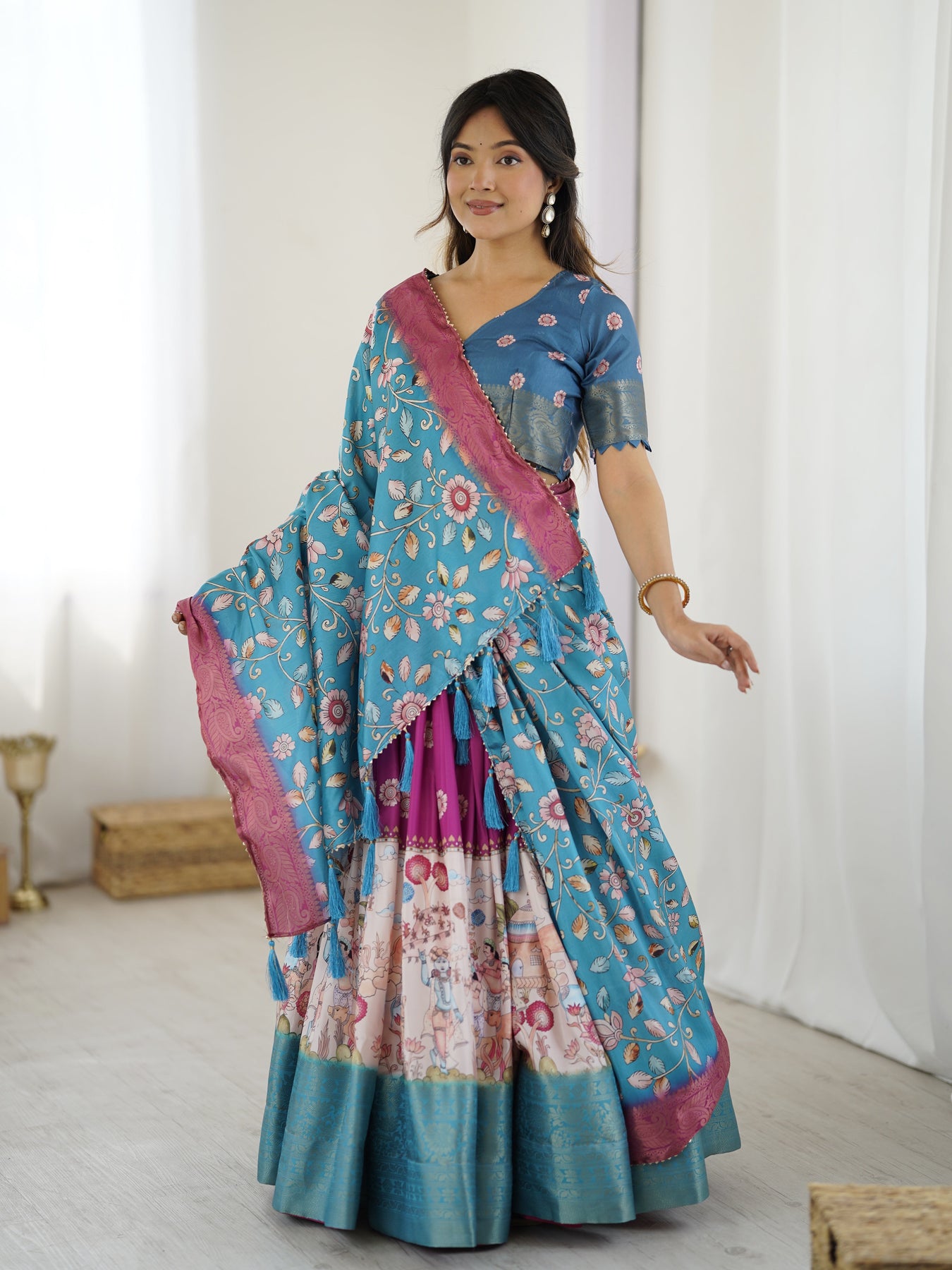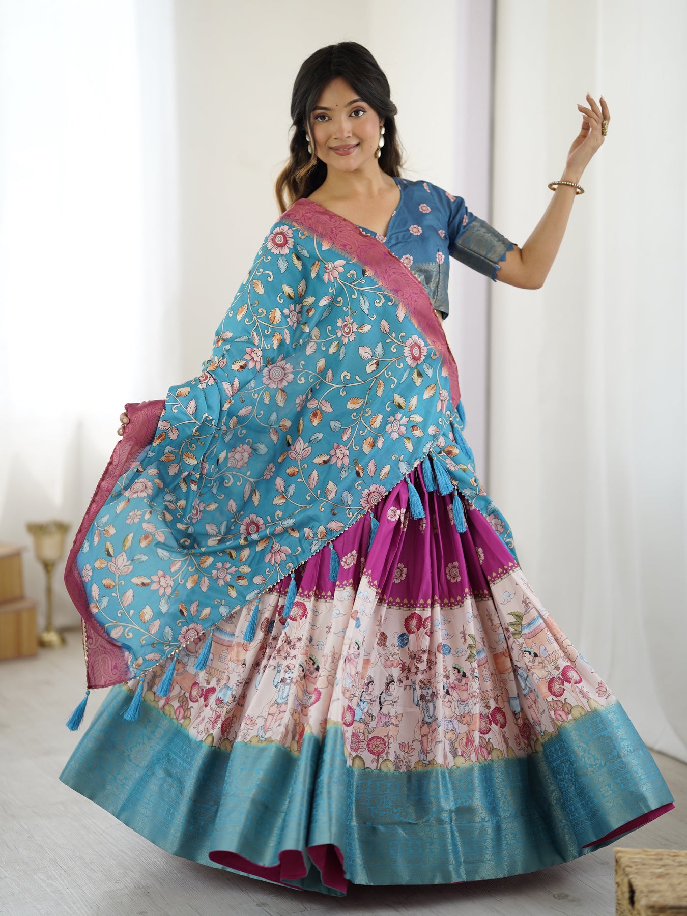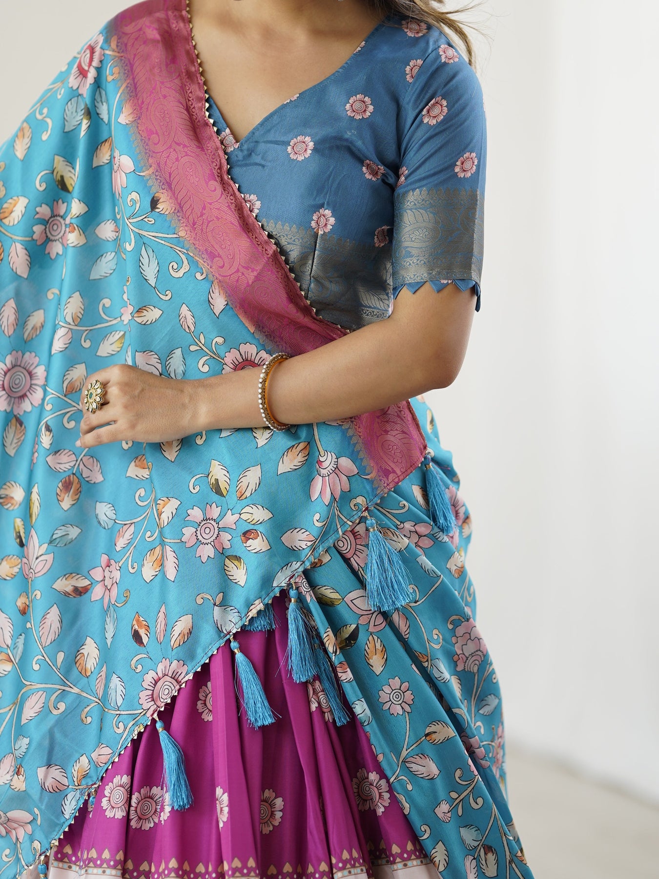 Turn heads with this vibrant Peacock Blue Kalamkari Lehenga, beautifully complemented by a rich magenta and pastel base. The flared skirt showcases traditional Kalamkari storytelling, while the floral-embroidered dupatta adds charm and elegance with zari accents and playful tassels. A perfect blend of cultural richness and youthful vibrance, ideal for weddings, festive events, and special gatherings.
