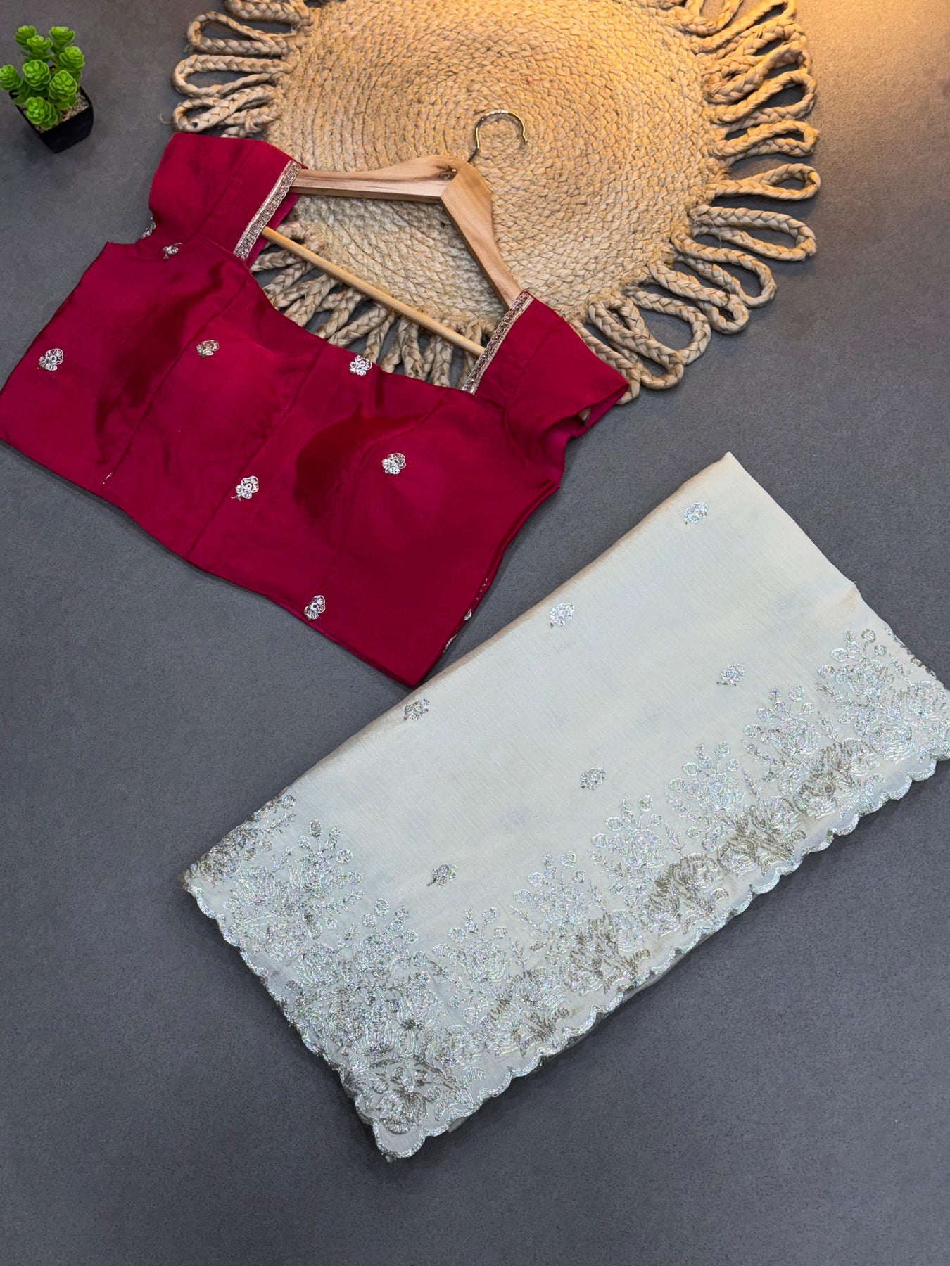 The subtle sheen of the fabric combined with the detailed embellishments makes it perfect for weddings, parties, and special occasions. Paired with a contrast blouse, this saree is a timeless addition to your ethnic wardrobe.