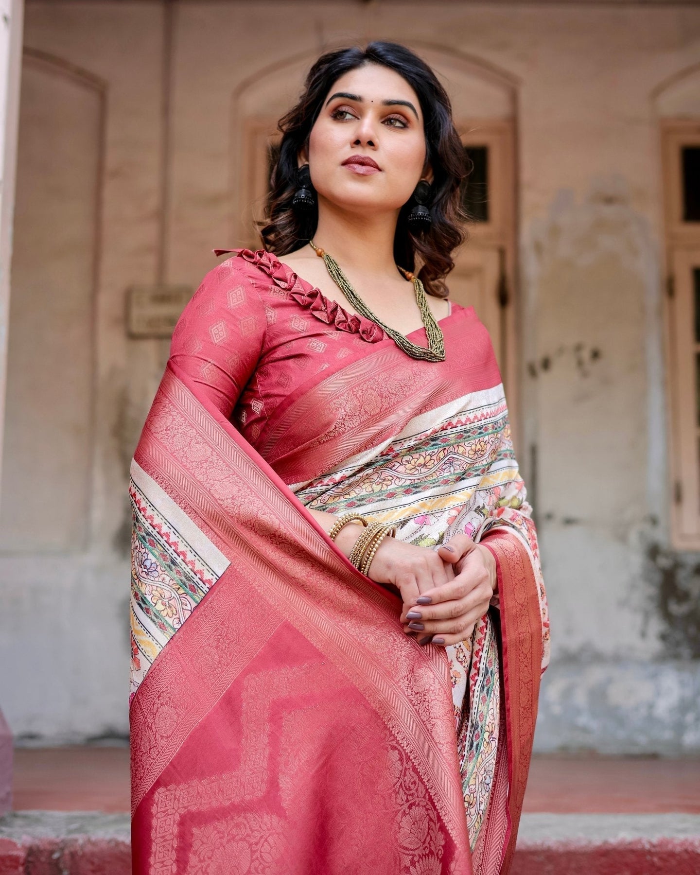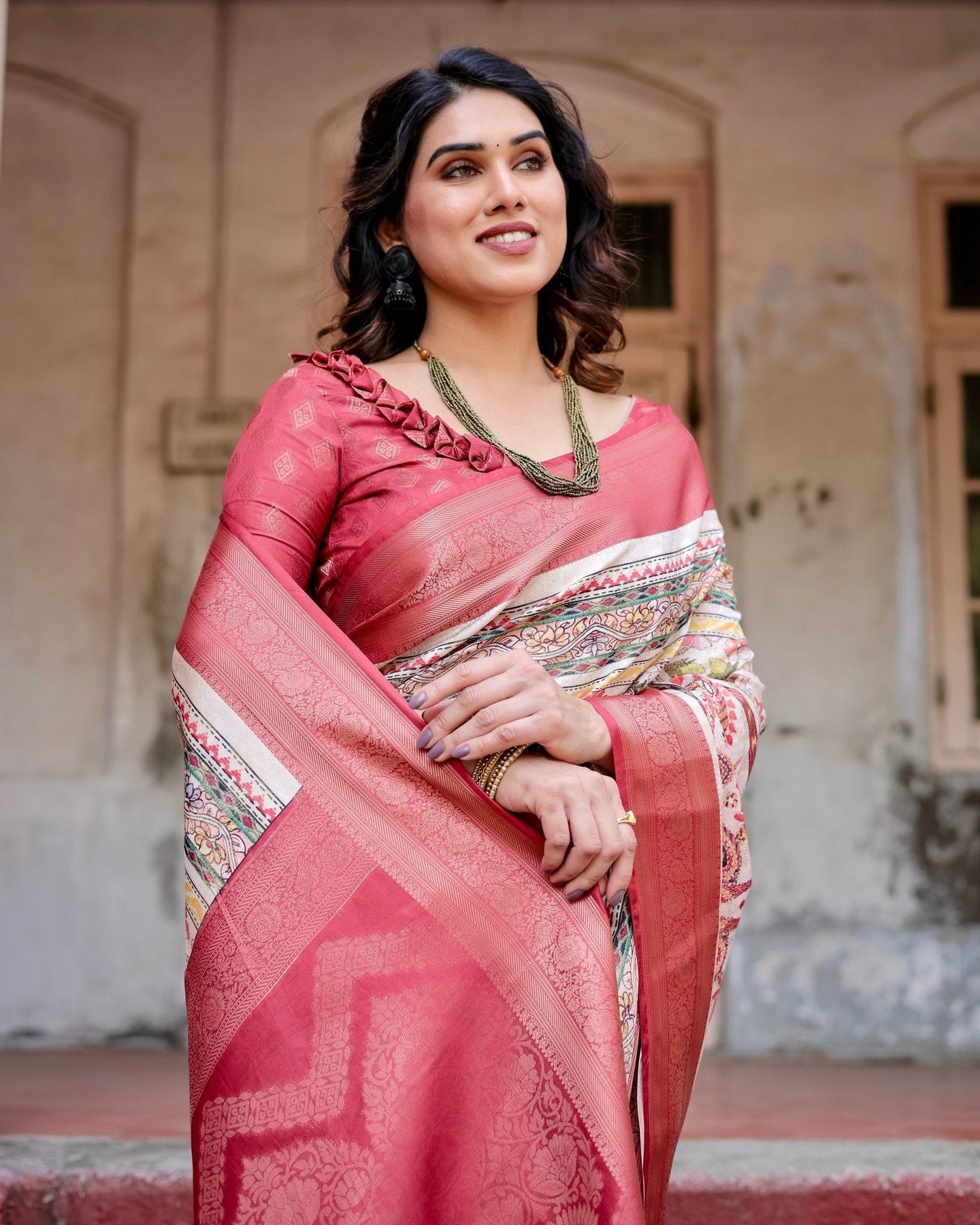 Elevate your ethnic collection with this pure Banarasi digitally printed silk saree, a masterpiece that seamlessly blends traditional artistry with modern sophistication.