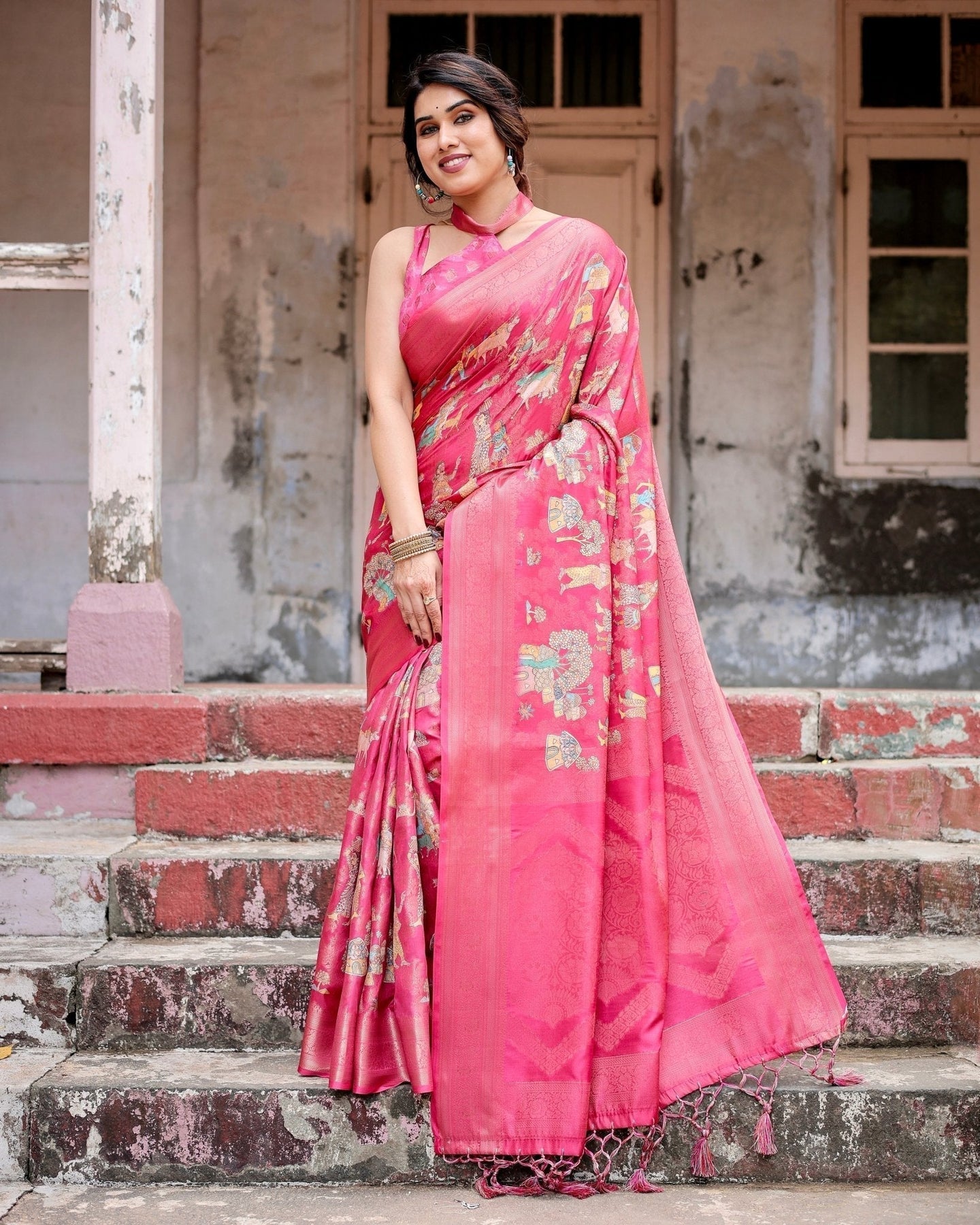 Elevate your wardrobe with this luxurious pink Banarasi silk saree adorned with detailed zari weaves and a vibrant procession-inspired motif. The intricate tassels on the pallu add a playful touch to its elegance. Perfect for weddings, festive occasions, or regal celebrations, this saree reflects a blend of tradition and modern sophistication. The soft silk fabric ensures comfort without compromising on grandeur. Pair it with statement jewelry for a complete royal look.