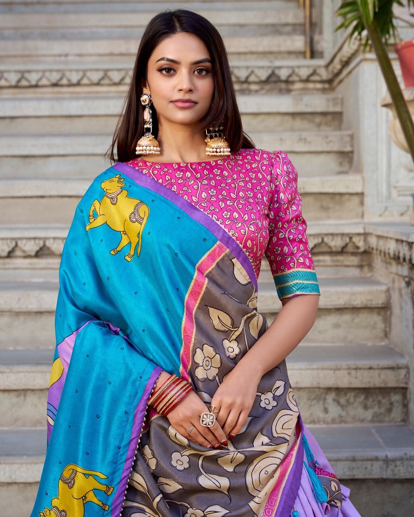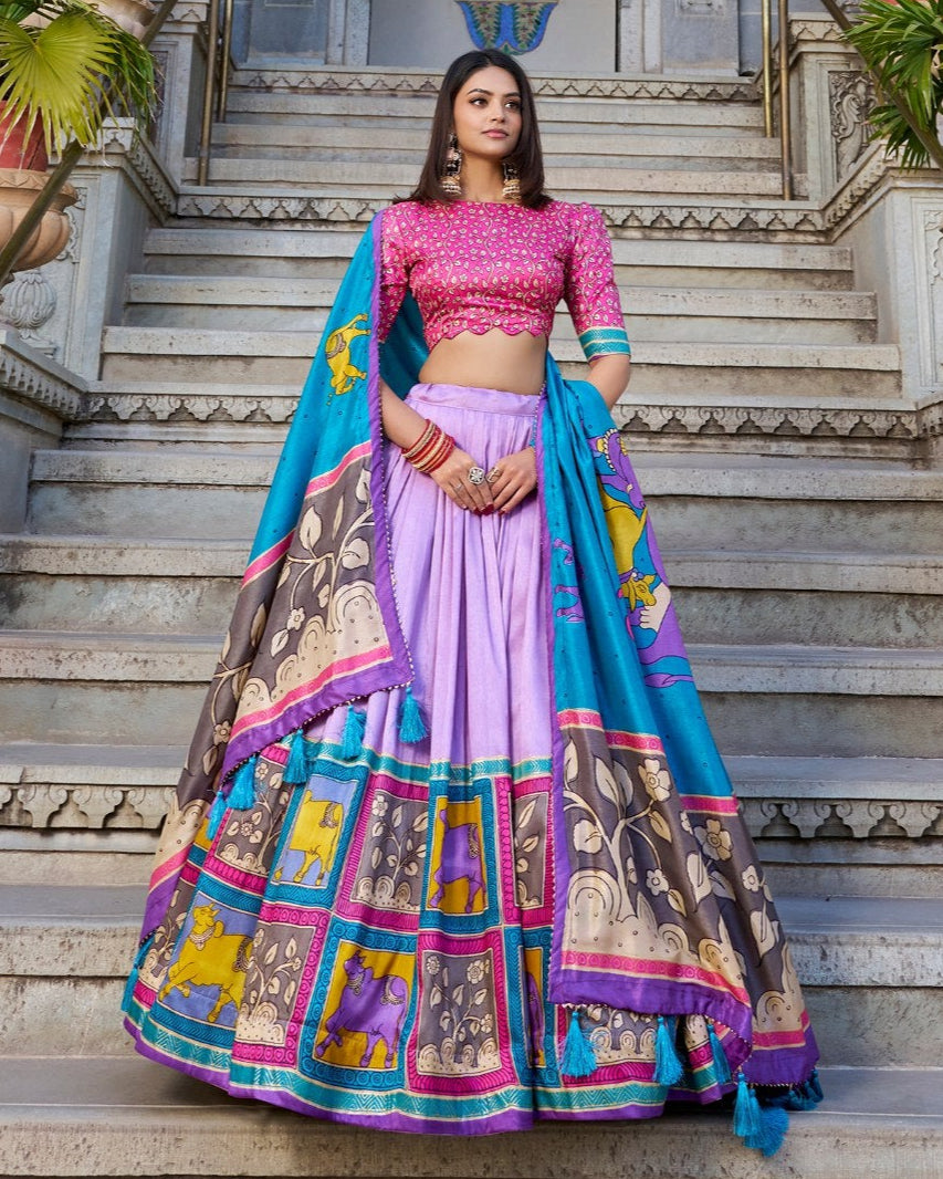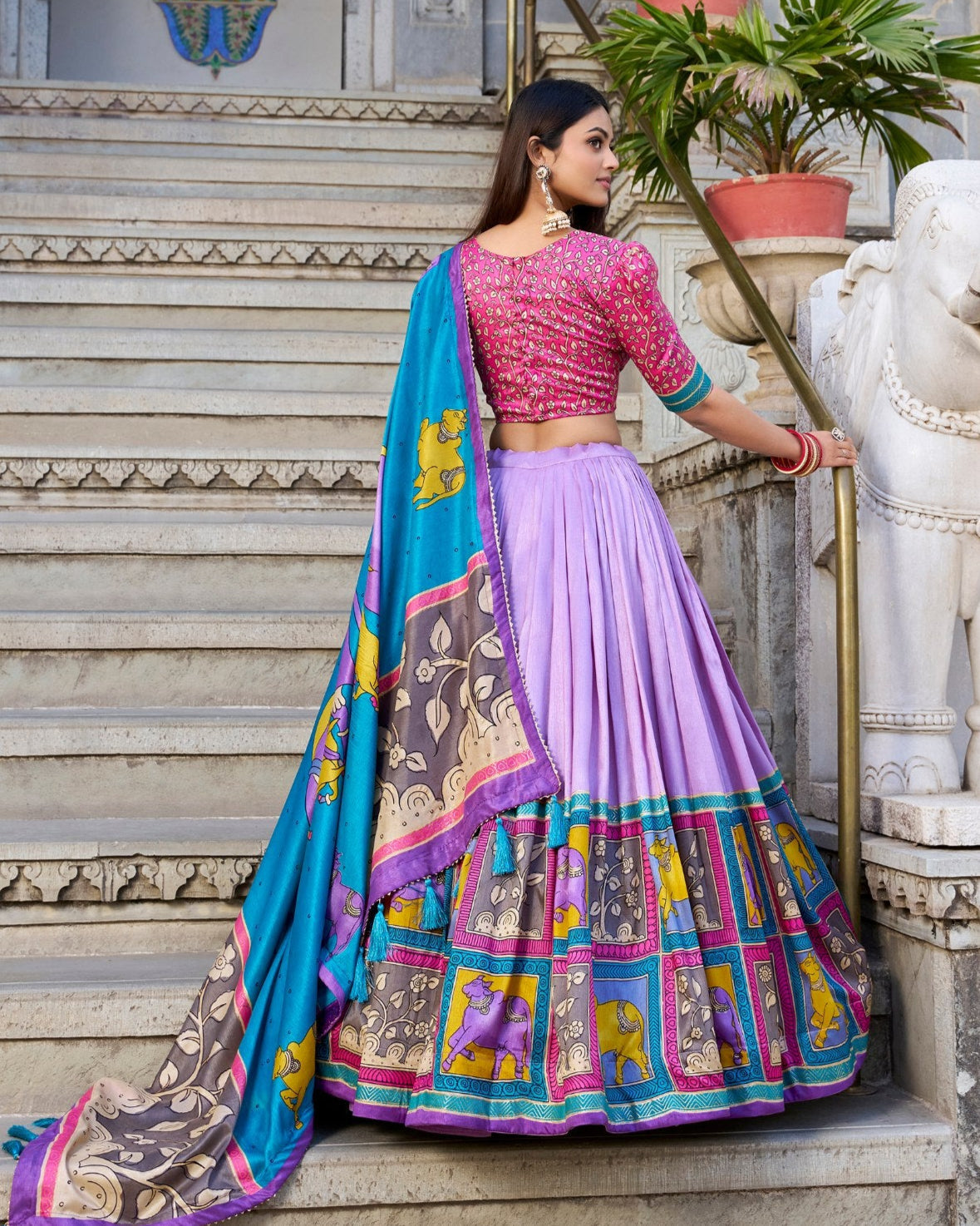 Royal Lilac & Azure Blue Kalamkari Tussar Silk Lehenga Set