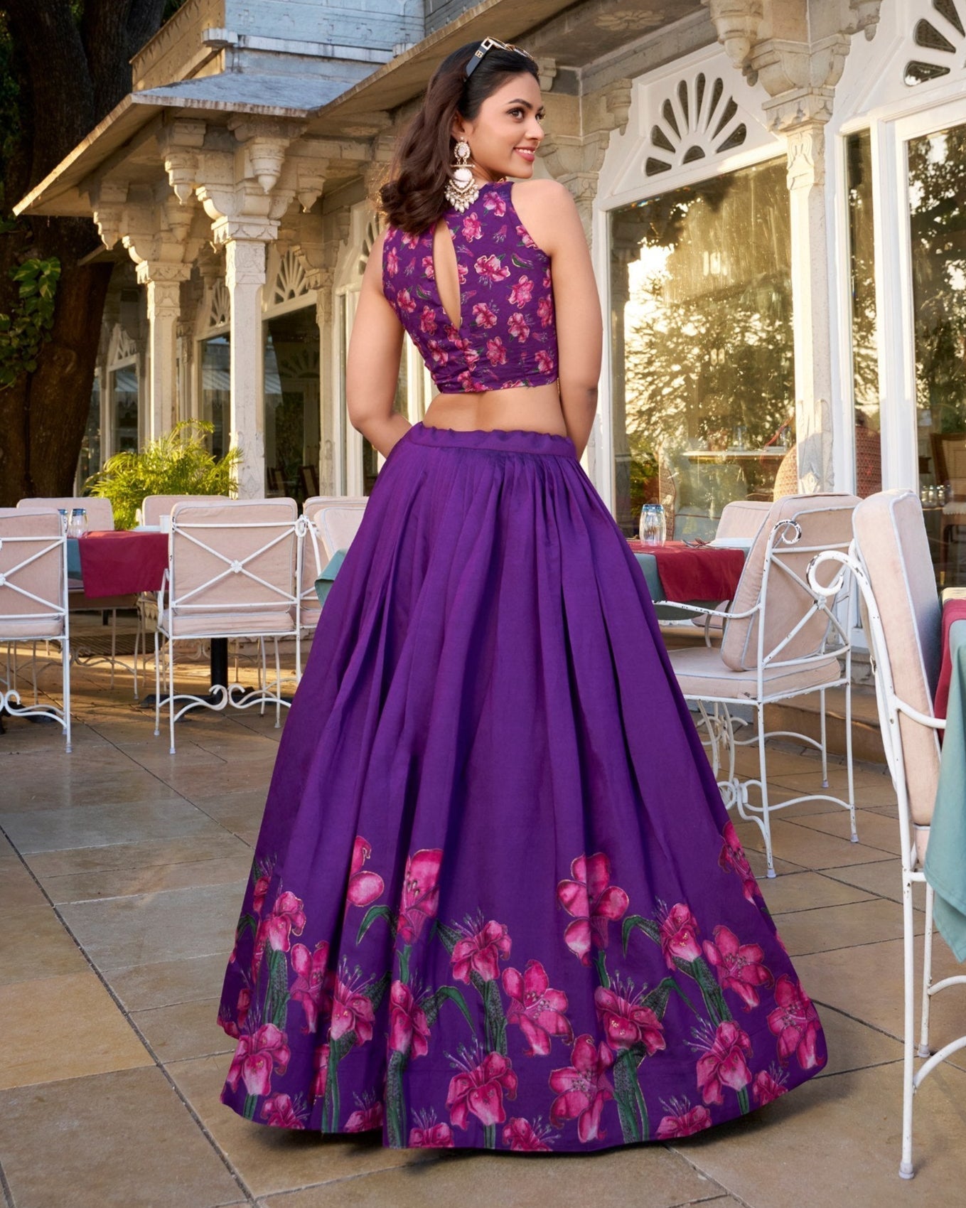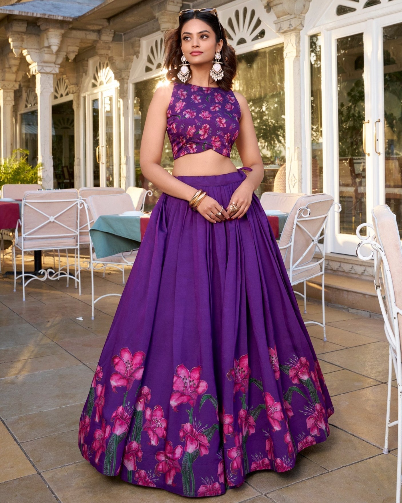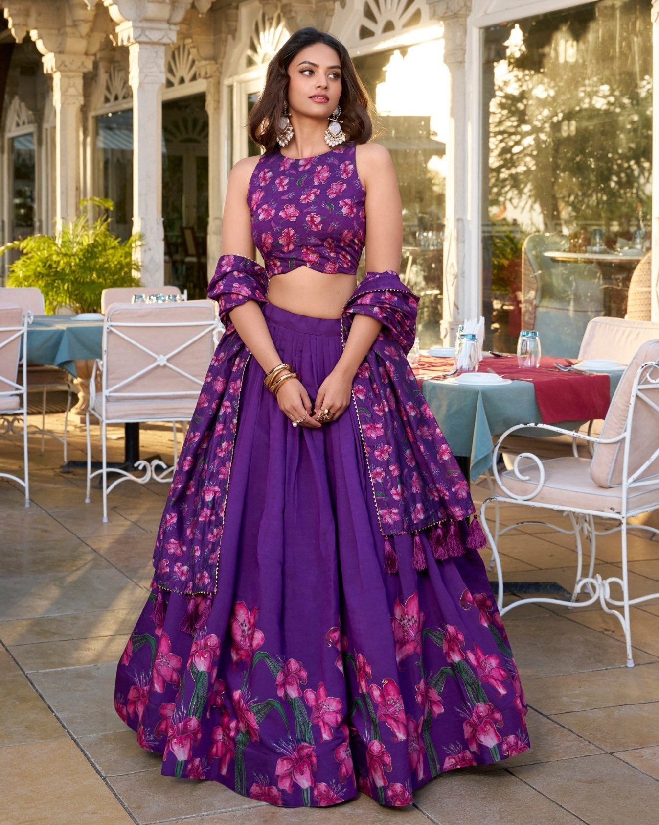 Royal Plum Blossom Tussar Silk Lehenga Set – A Floral Symphony of Elegance & Grace