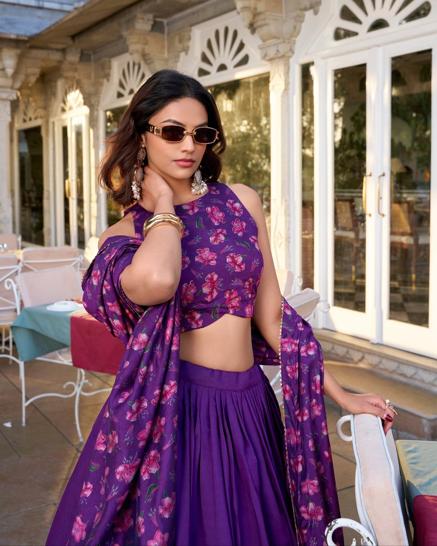 Step into the world of opulence with this Royal Plum Blossom Tussar Silk Lehenga Set, a breathtaking creation that blends the charm of floral artistry with modern sophistication. Designed with intricate floral prints, delicate foil work, and a mesmerizing deep plum hue, this ensemble is the perfect choice for weddings, festive occasions, and grand celebrations.