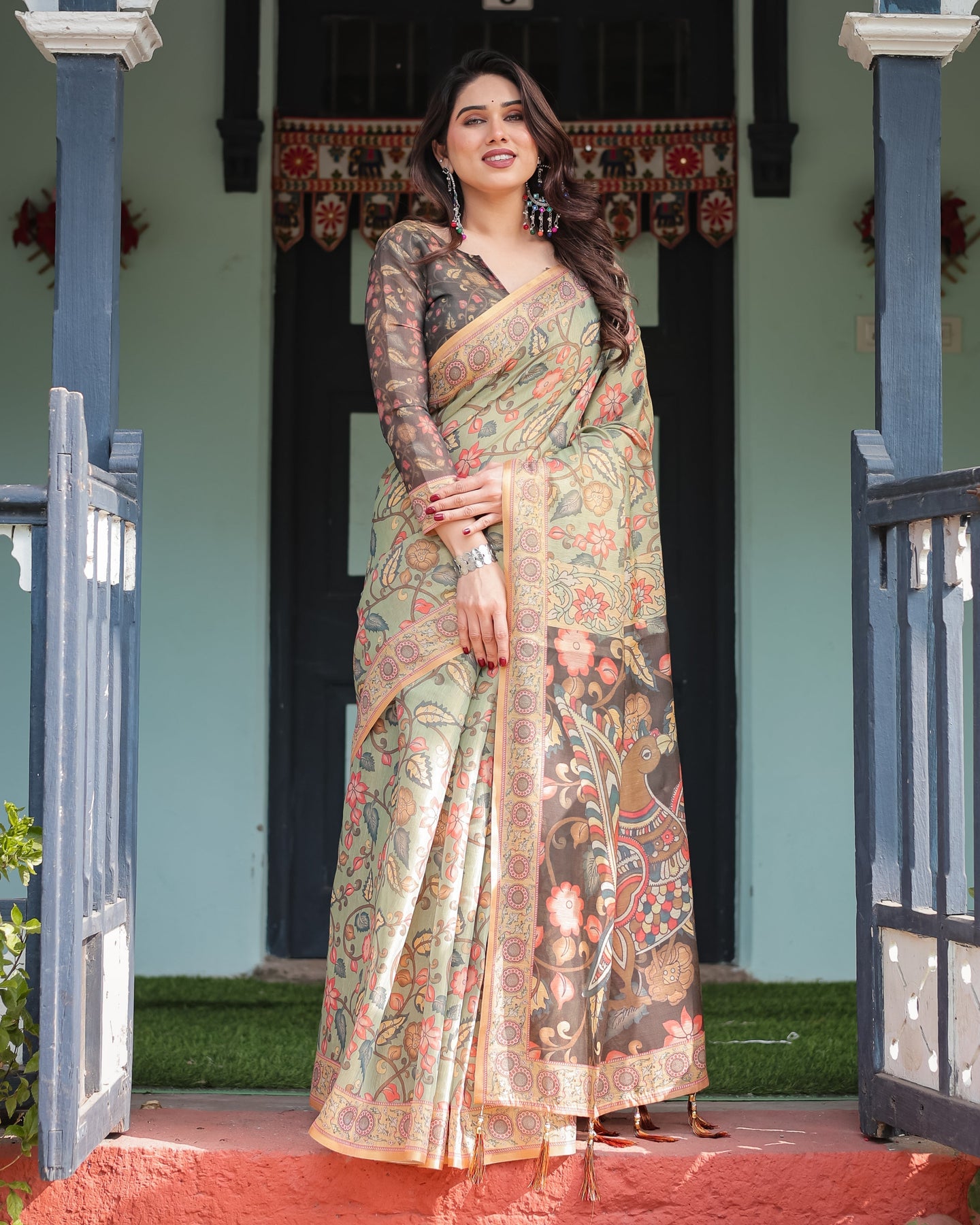 Add this sage green linen cotton saree to your collection and let its vibrant peacock pallu and intricate floral designs reflect your refined taste and elegance.