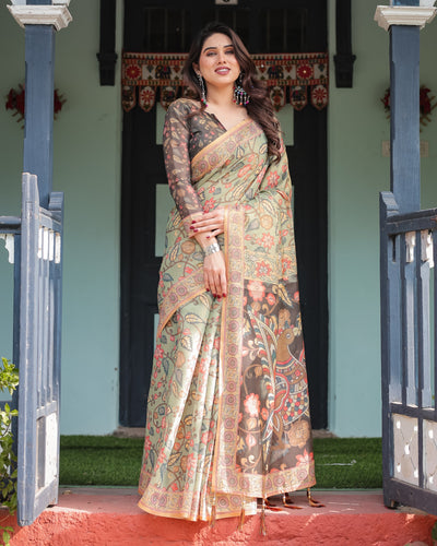 Redefine elegance with this Pure Linen Cotton Handloom Printed Saree in a soothing sage green hue, complemented by bold floral designs and a stunning vibrant peacock pallu. This saree is a perfect blend of artistic charm and contemporary sophistication, ideal for making a statement on any occasion.
