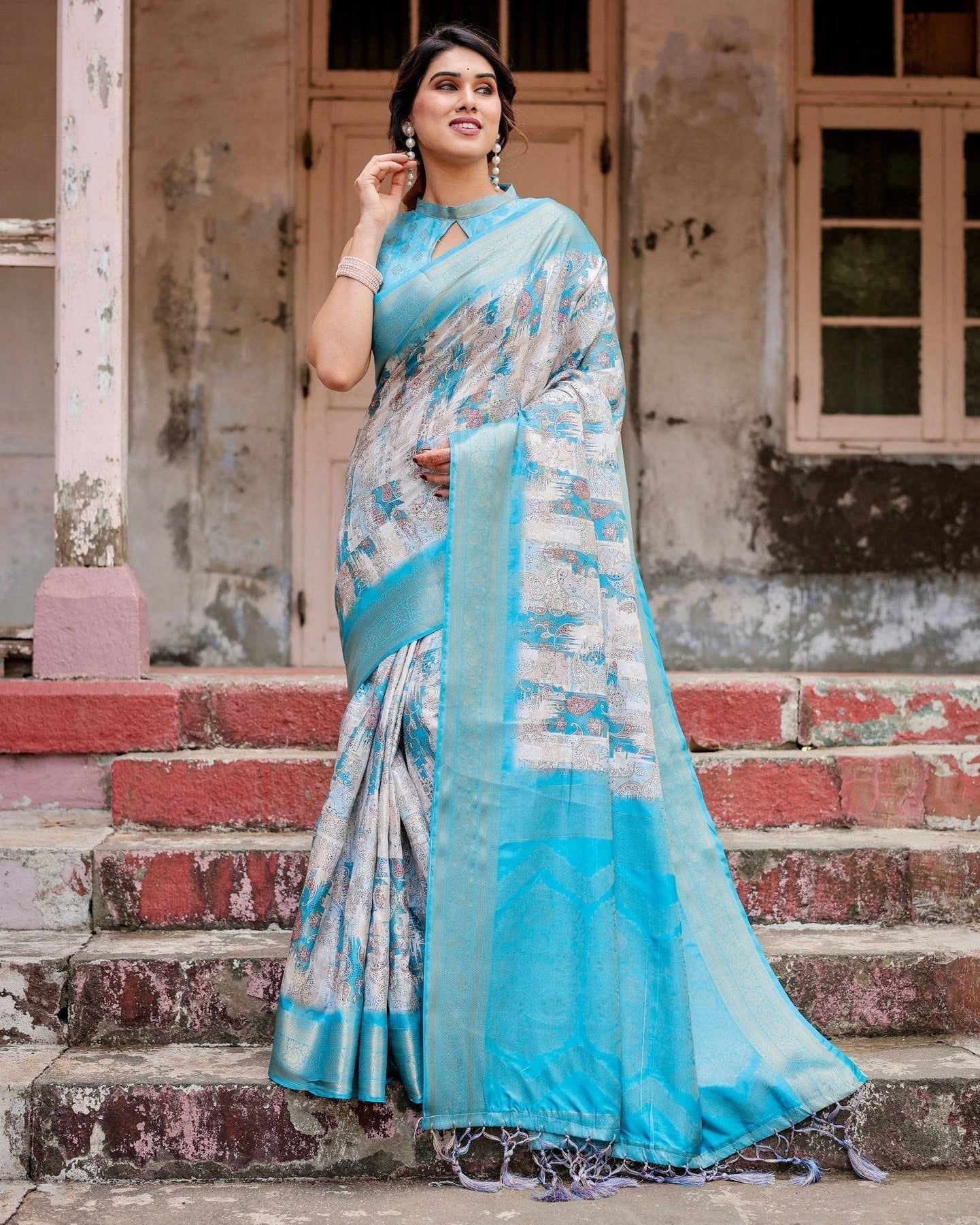 Design: Showcases vibrant digital prints combined with traditional Banarasi motifs, creating a unique and captivating aesthetic.