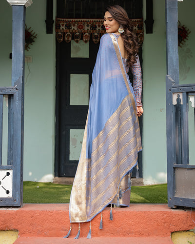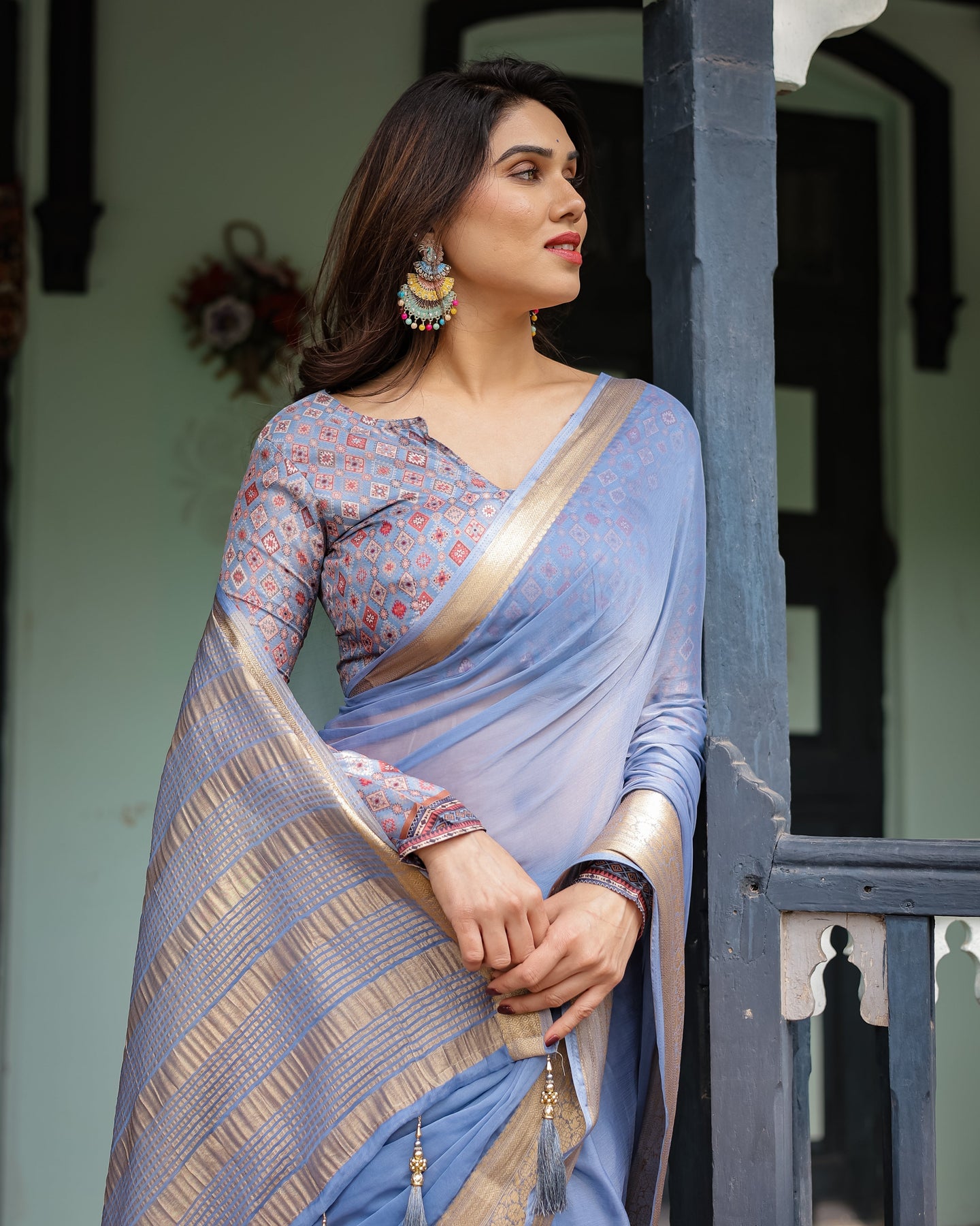 Step into elegance with this sky blue plain chiffon saree, a perfect blend of simplicity and sophistication. The saree is adorned with a gold zari border, intricately designed with floral and geometric patterns, adding a touch of timeless beauty. Its lightweight chiffon fabric ensures an effortless drape, making it ideal for weddings, festive celebrations, and formal gatherings.