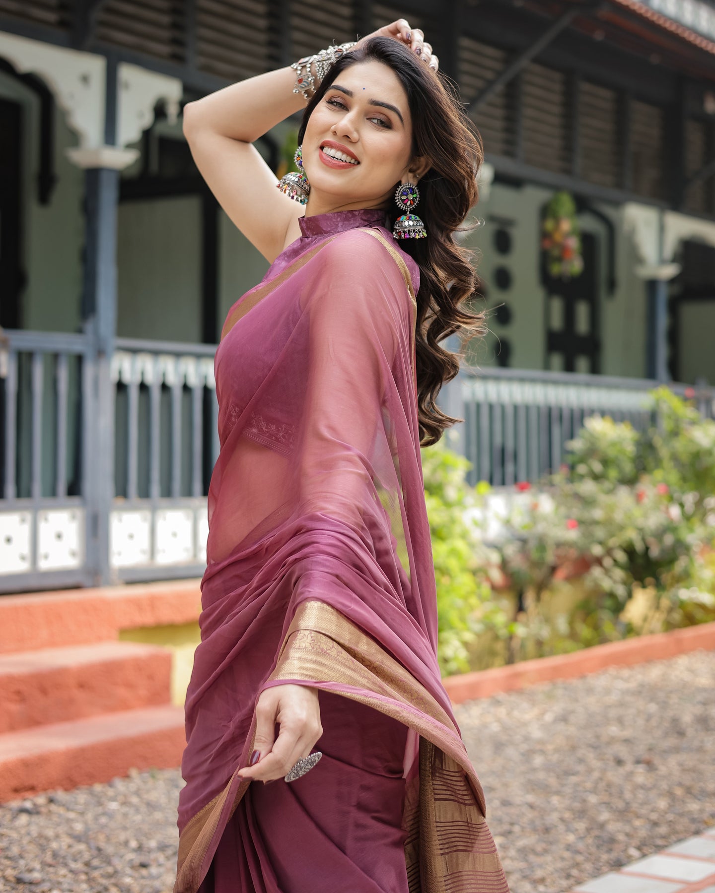 Step into timeless elegance with this mauve plain chiffon saree, a perfect combination of grace and contemporary style. The saree is adorned with a rich gold zari border, intricately woven with floral and geometric patterns, adding a regal and luxurious touch. Its lightweight chiffon fabric ensures a fluid and flattering drape, perfect for festive occasions, weddings, or formal events.