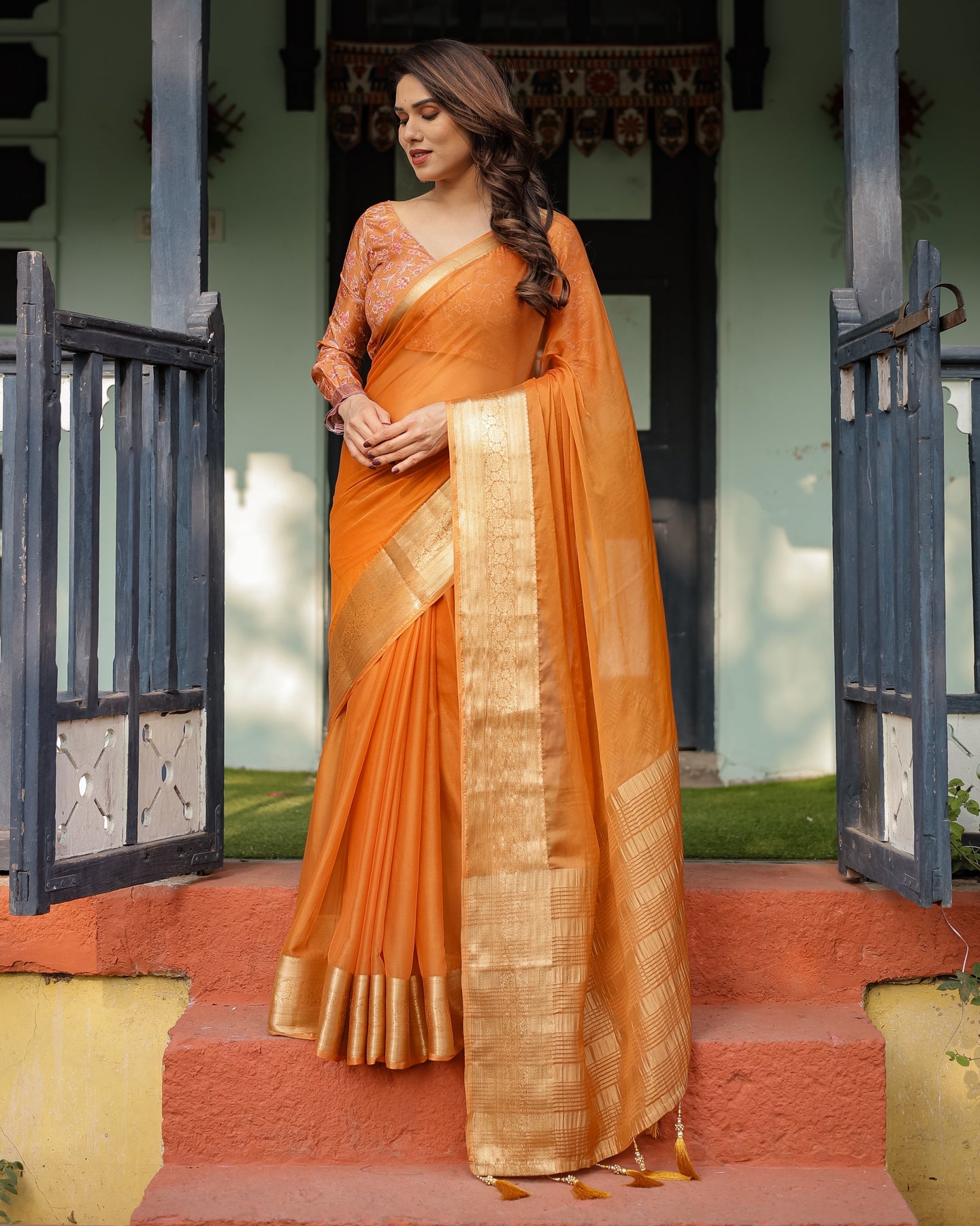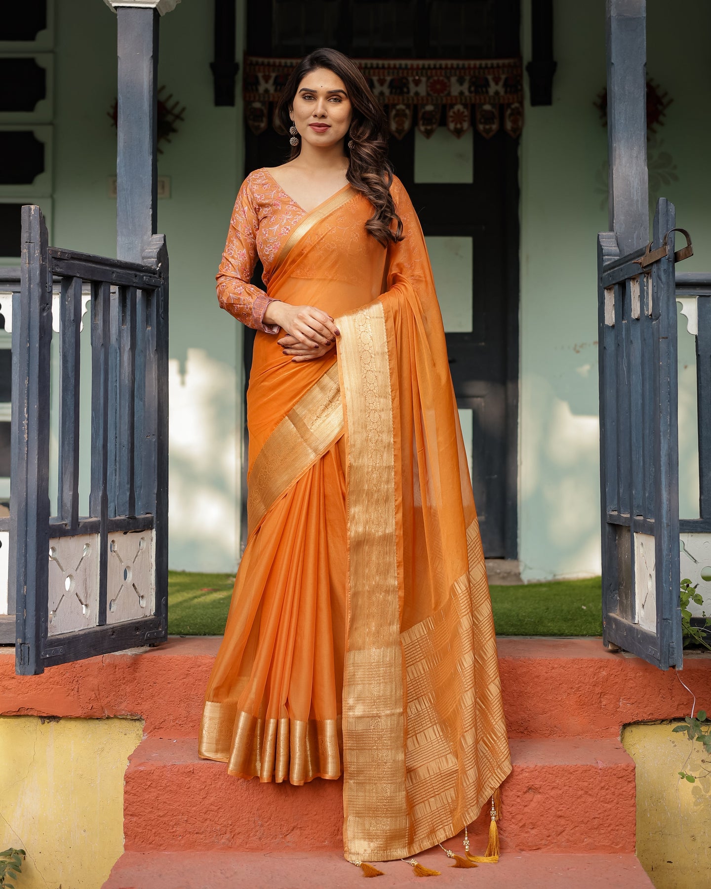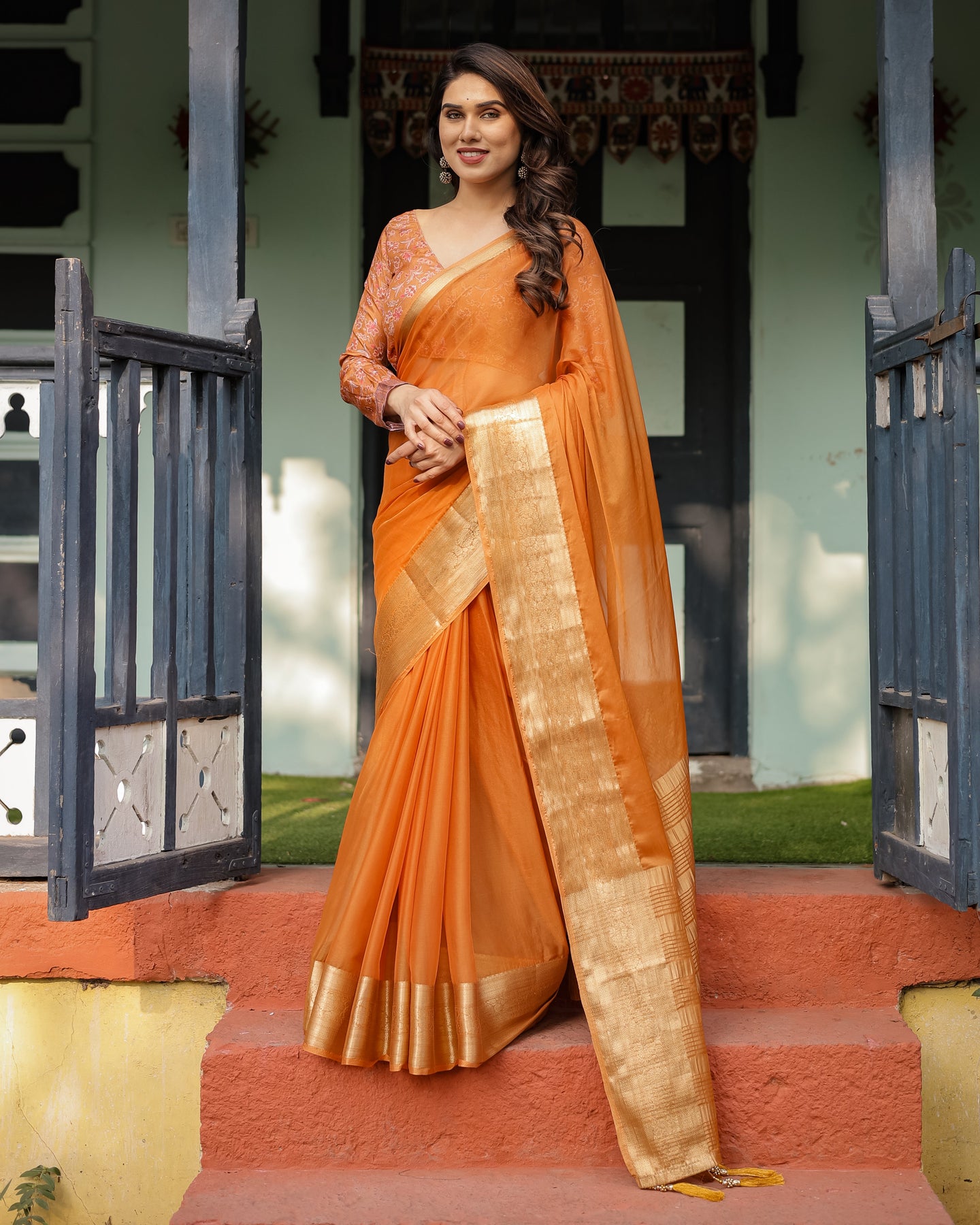 Brighten up your look with this sunset orange plain chiffon saree, a stunning ensemble that exudes elegance and charm. Featuring a rich gold zari border, intricately detailed with floral and traditional patterns, this saree brings timeless sophistication to your wardrobe. Its lightweight chiffon fabric ensures a fluid drape, making it ideal for weddings, festive gatherings, or evening celebrations.