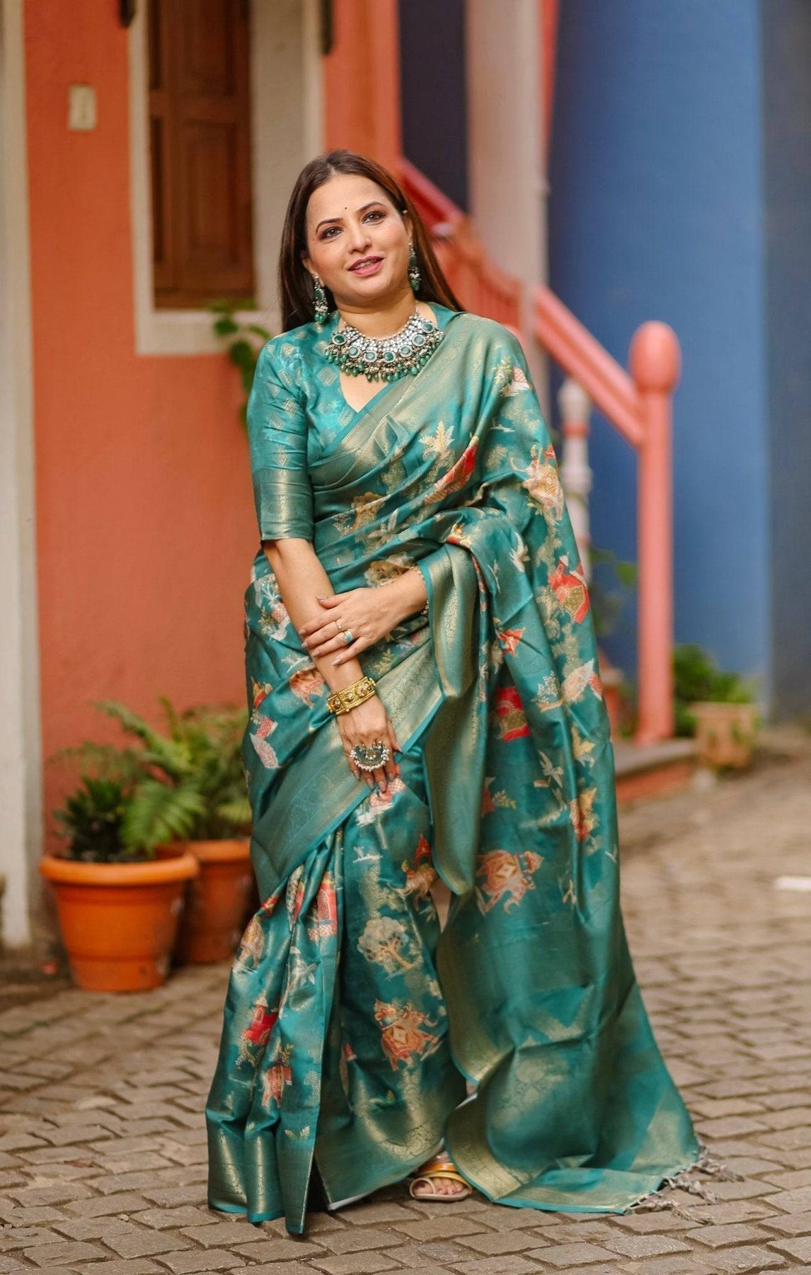 Exude elegance with this enchanting Banarasi silk saree in a captivating teal shade, adorned with intricate traditional motifs depicting scenic elements that celebrate Indian heritage. The saree is framed with a rich zari-woven border, enhancing its luxurious appeal. The pallu is a masterpiece of craftsmanship, featuring elaborate zari work that complements the overall design. Perfect for weddings, festive occasions, or cultural celebrations, this saree is a true reflection of timeless tradition and modern sophistication. Pair it with statement jewelry to create a stunning ensemble.