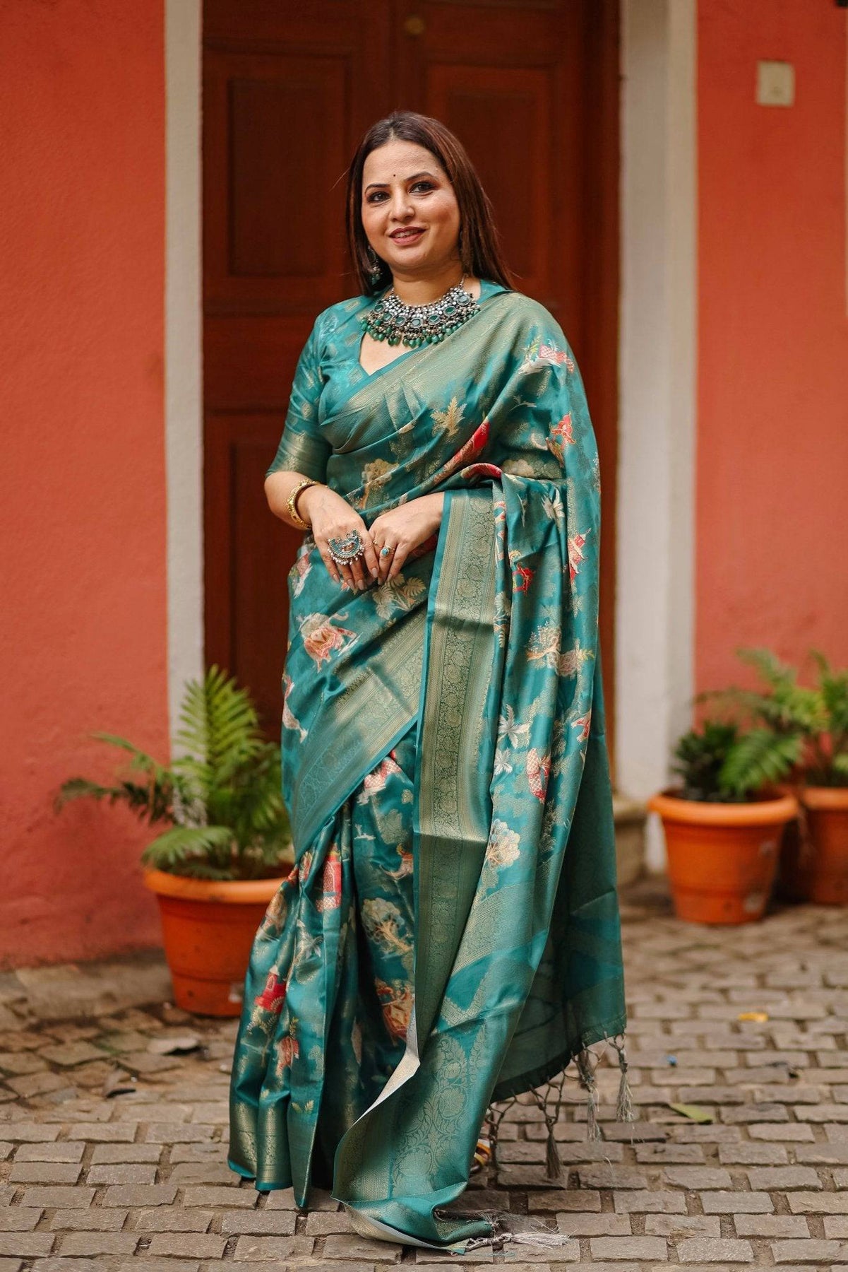 Elevate your ethnic collection with this pure Banarasi digitally printed silk saree, a masterpiece that seamlessly blends traditional artistry with modern sophistication.