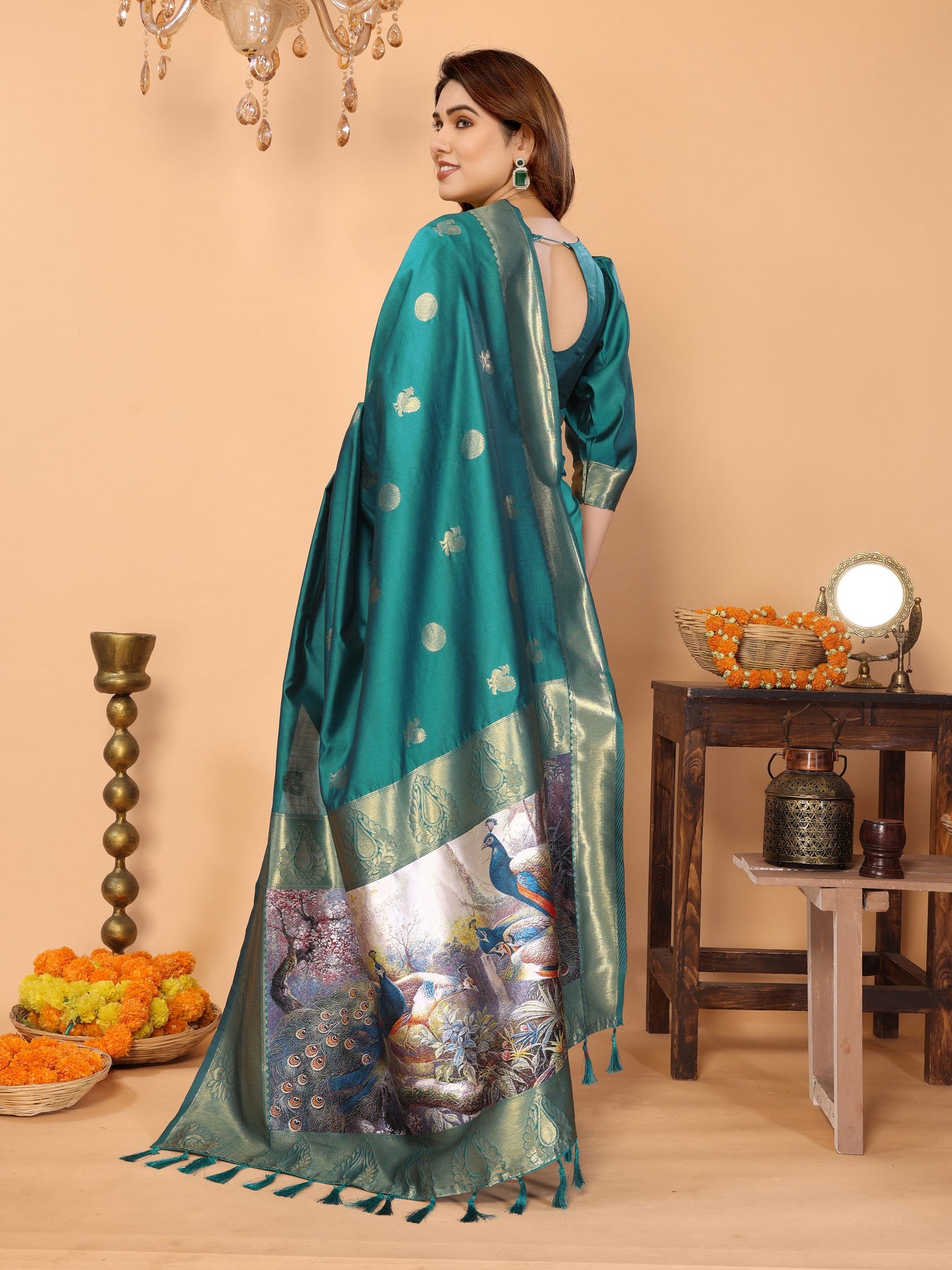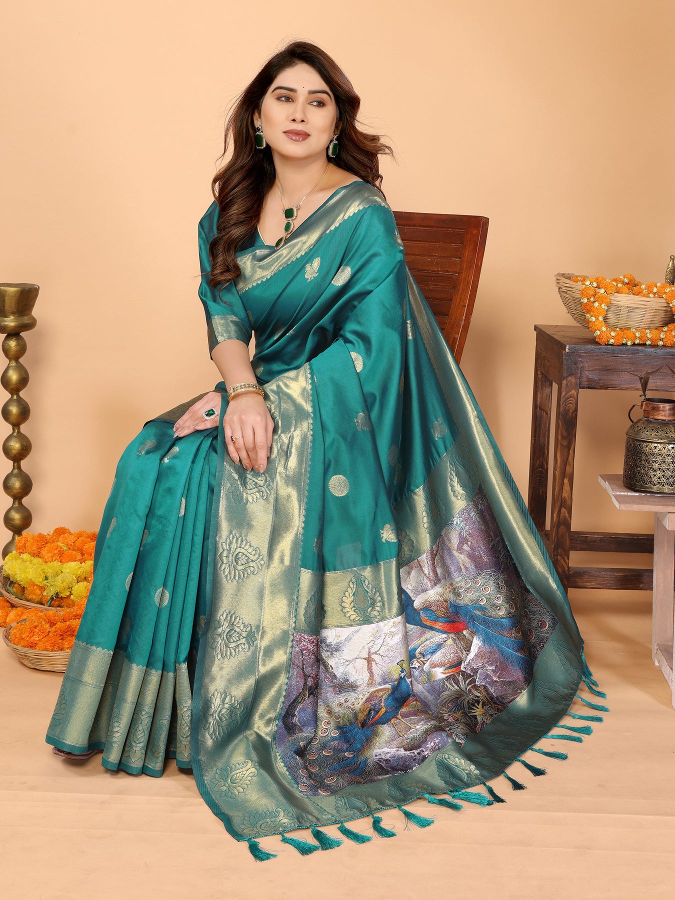 Elevate your ethnic wardrobe with this stunning Teal Green Banarasi Silk Saree, gracefully adorned with golden zari woven motifs all over the drape. The luxurious silk fabric offers a rich texture and elegant fall, making it ideal for festive occasions and traditional celebrations.