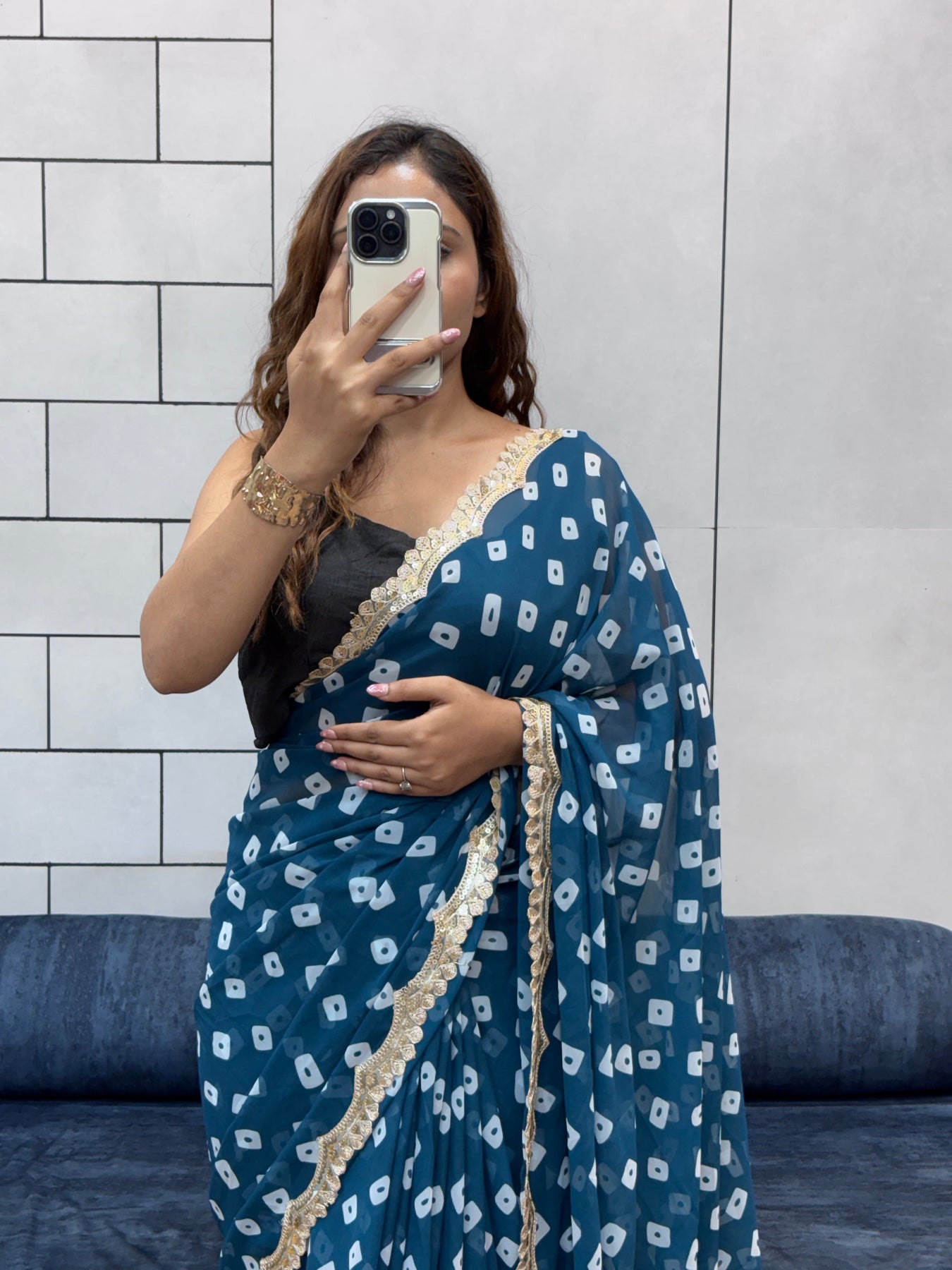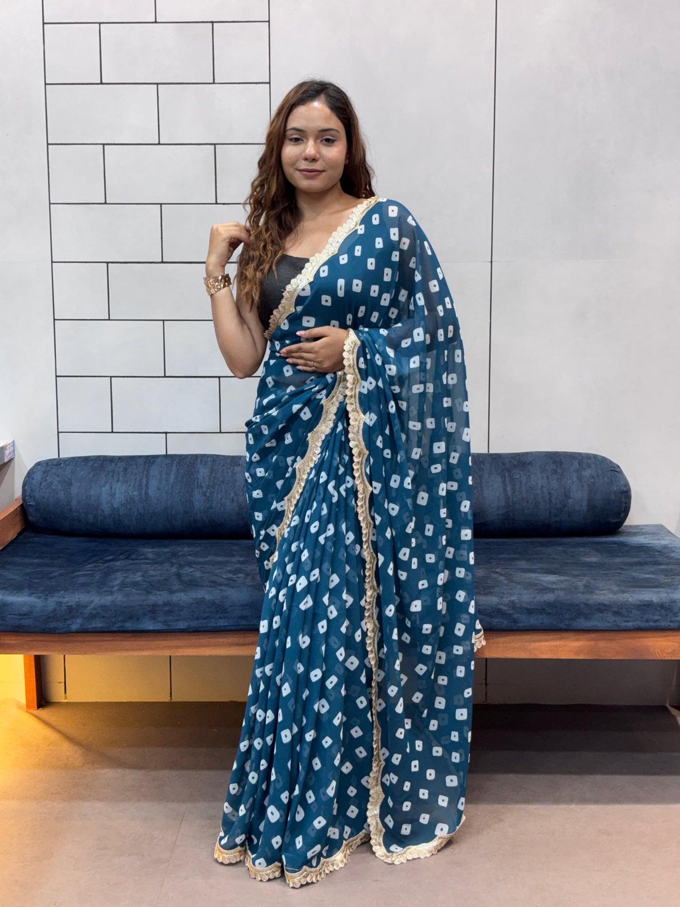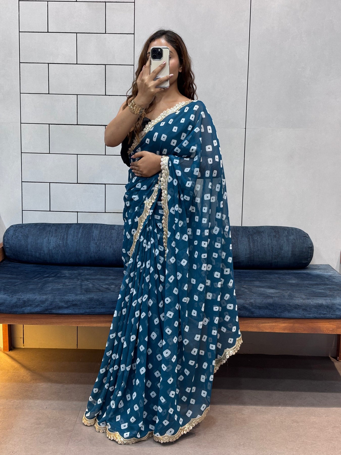 Elevate your festive style with this Teal Blue Bandhani Georgette Saree, featuring a delicate embroidery lace border for a refined touch. Accompanied by a matching running blouse, this saree offers the perfect mix of traditional charm and modern elegance for weddings, festive events, and special celebrations.
