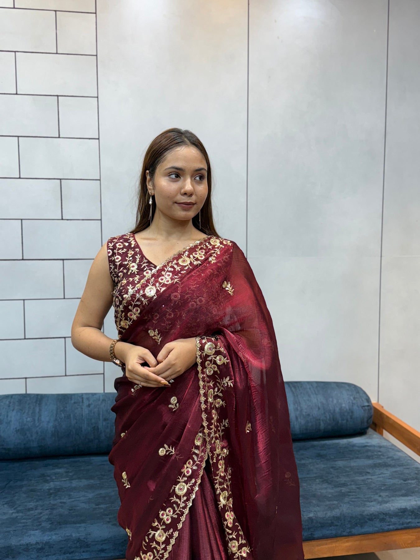 Wine color Space silk Saree with Golden Floral Embroidery & Designer Blouse - Festive & Party Wear