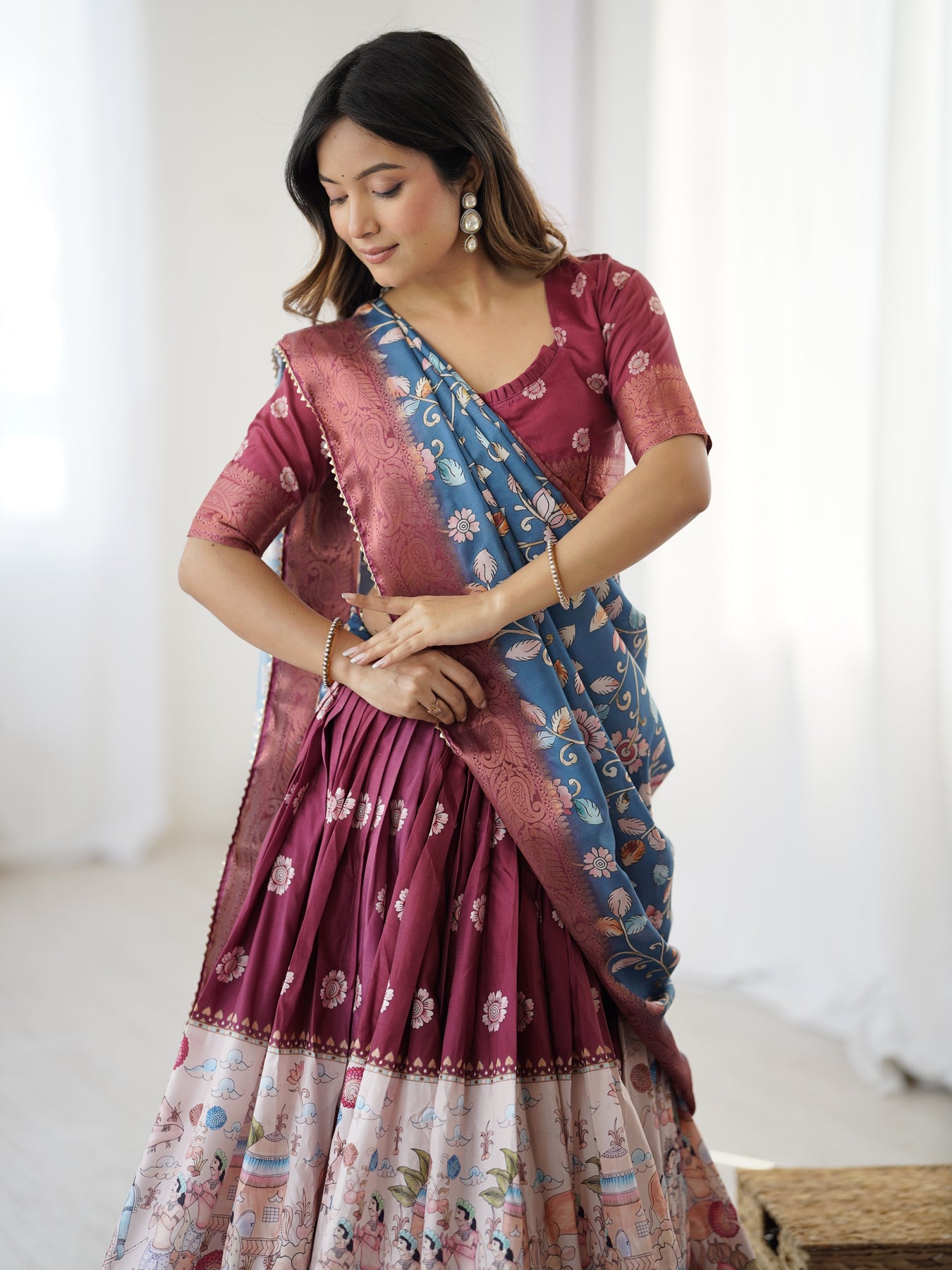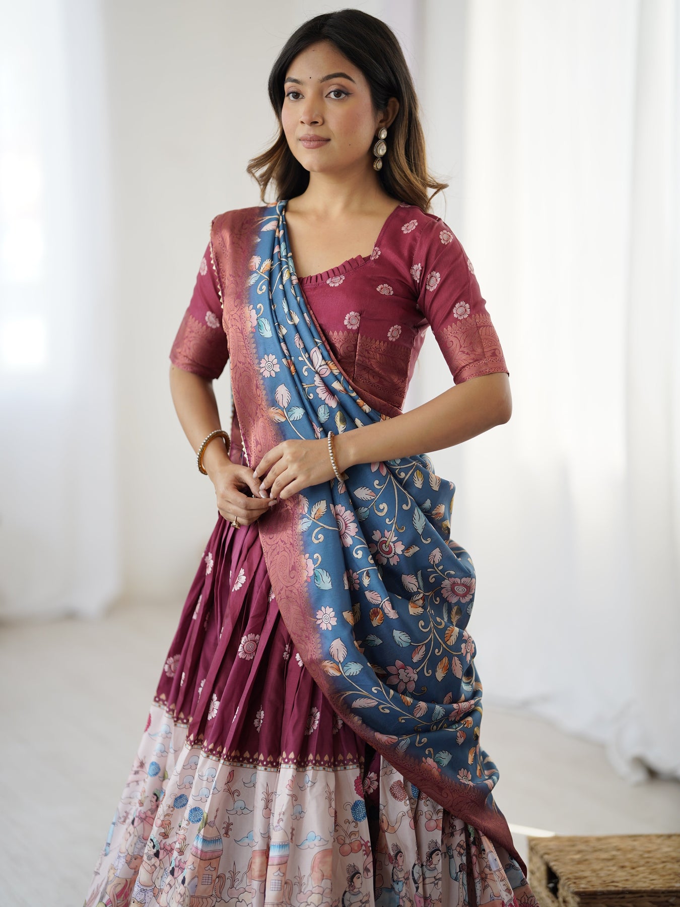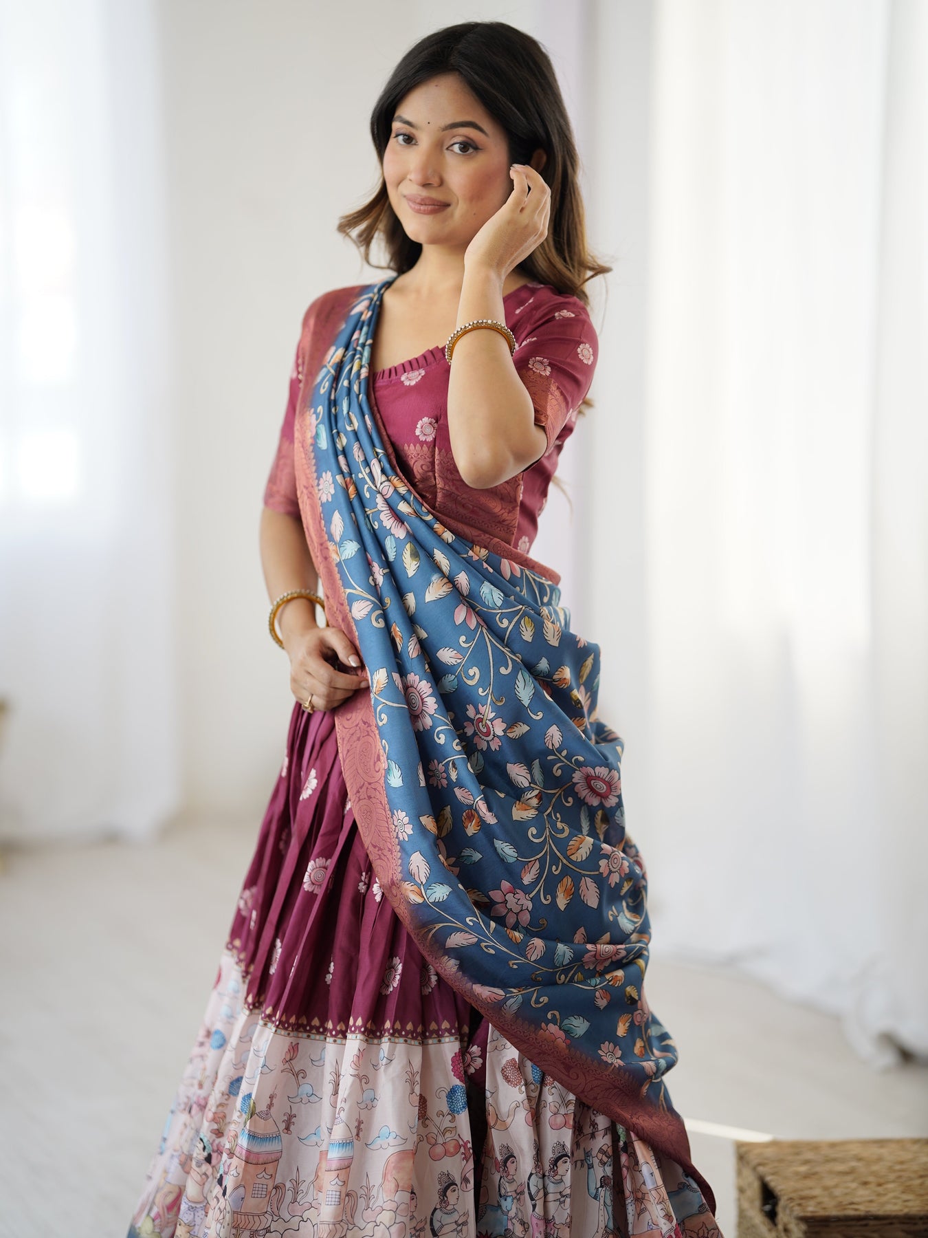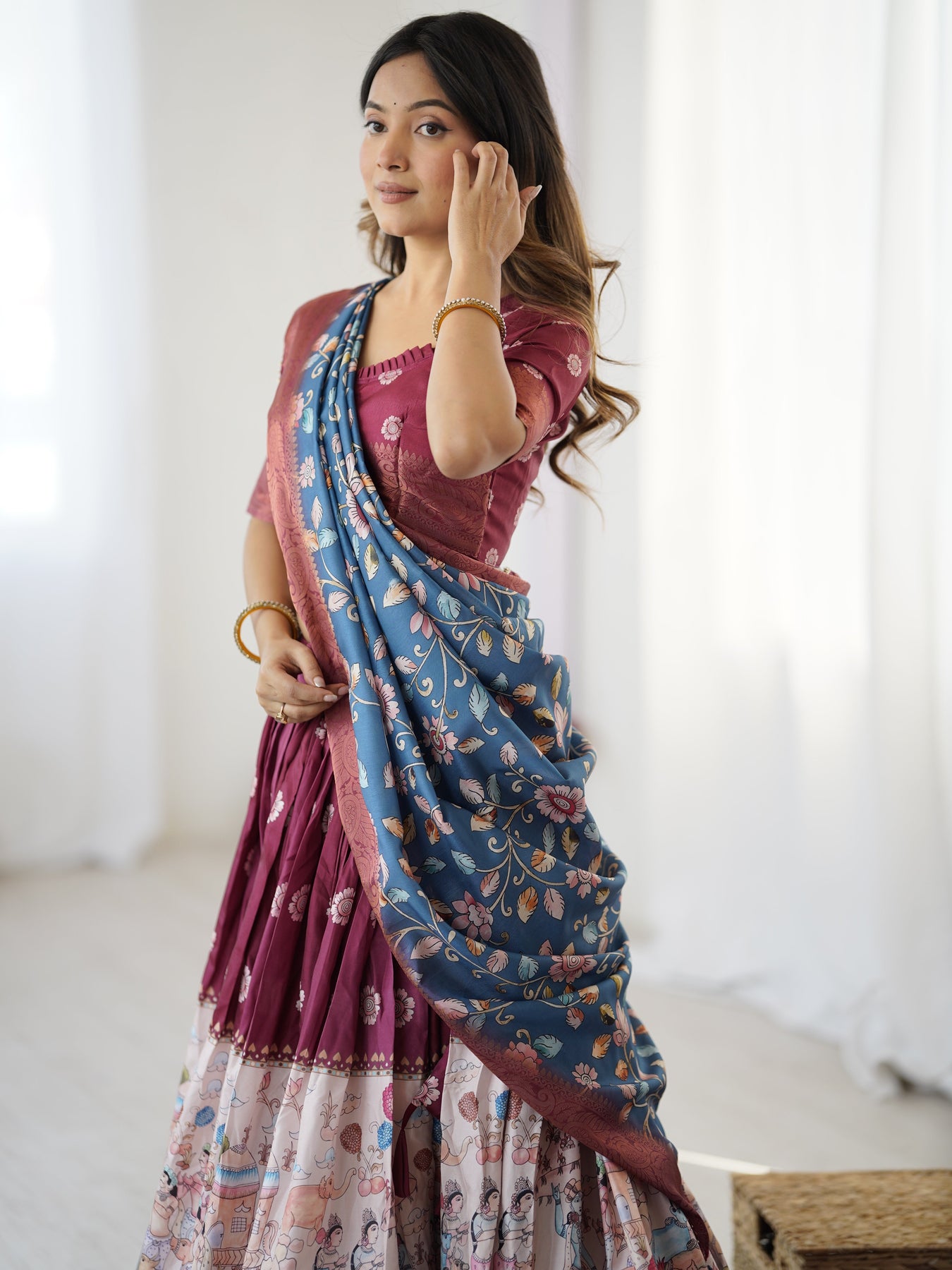 Drape yourself in the elegance of heritage with this Wine Maroon Kalamkari Flared Lehenga, perfectly complemented by a stunning blue floral dupatta. Crafted with intricate kalamkari digital prints and zari woven borders, this ensemble embodies the grace of Indian tradition in a modern, wearable form.