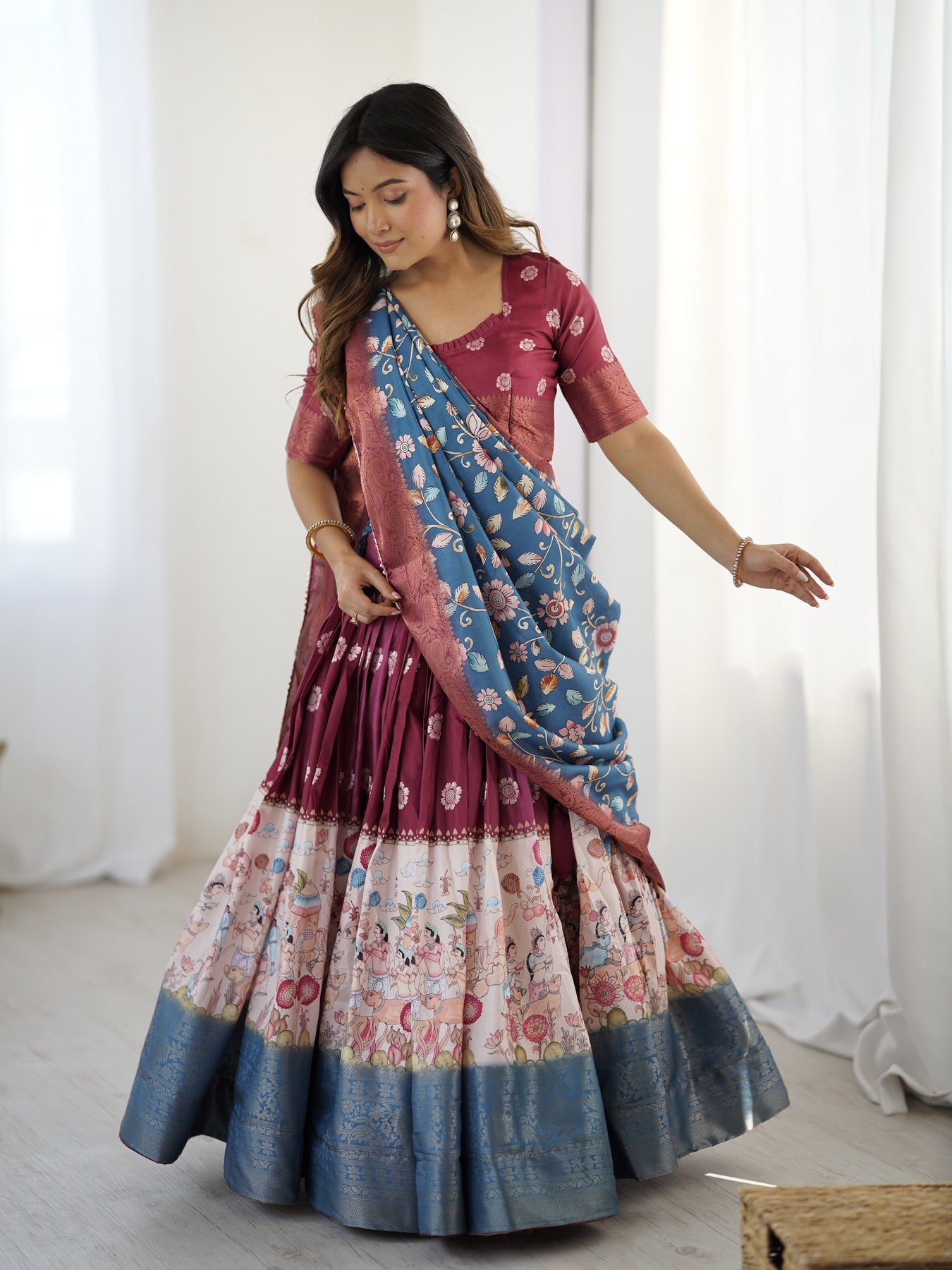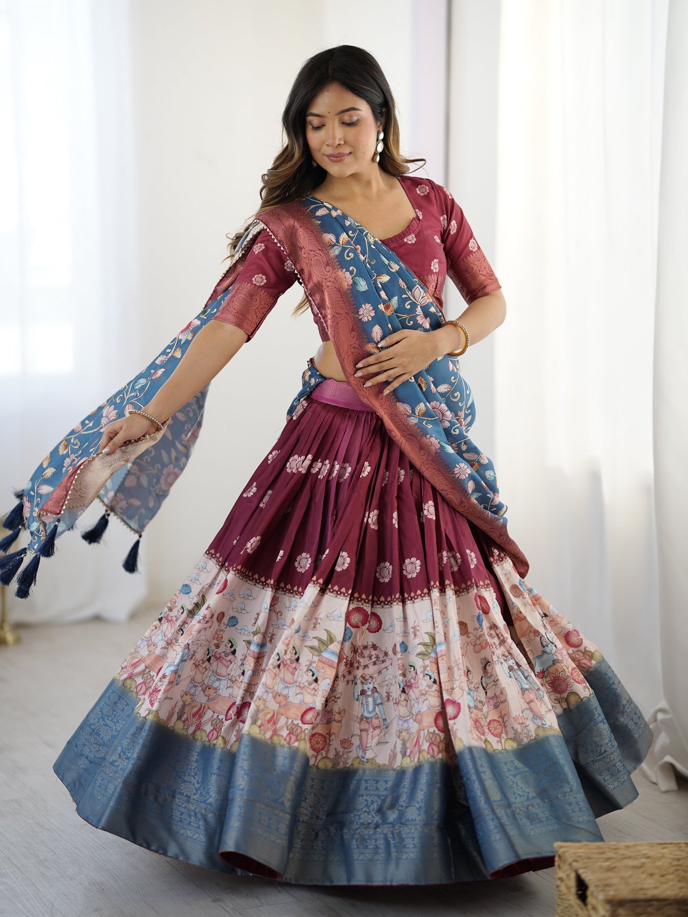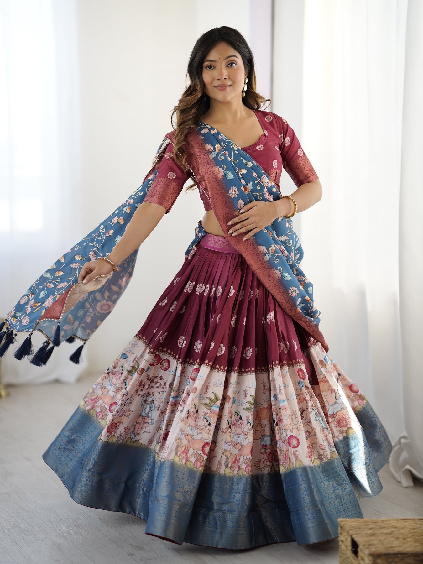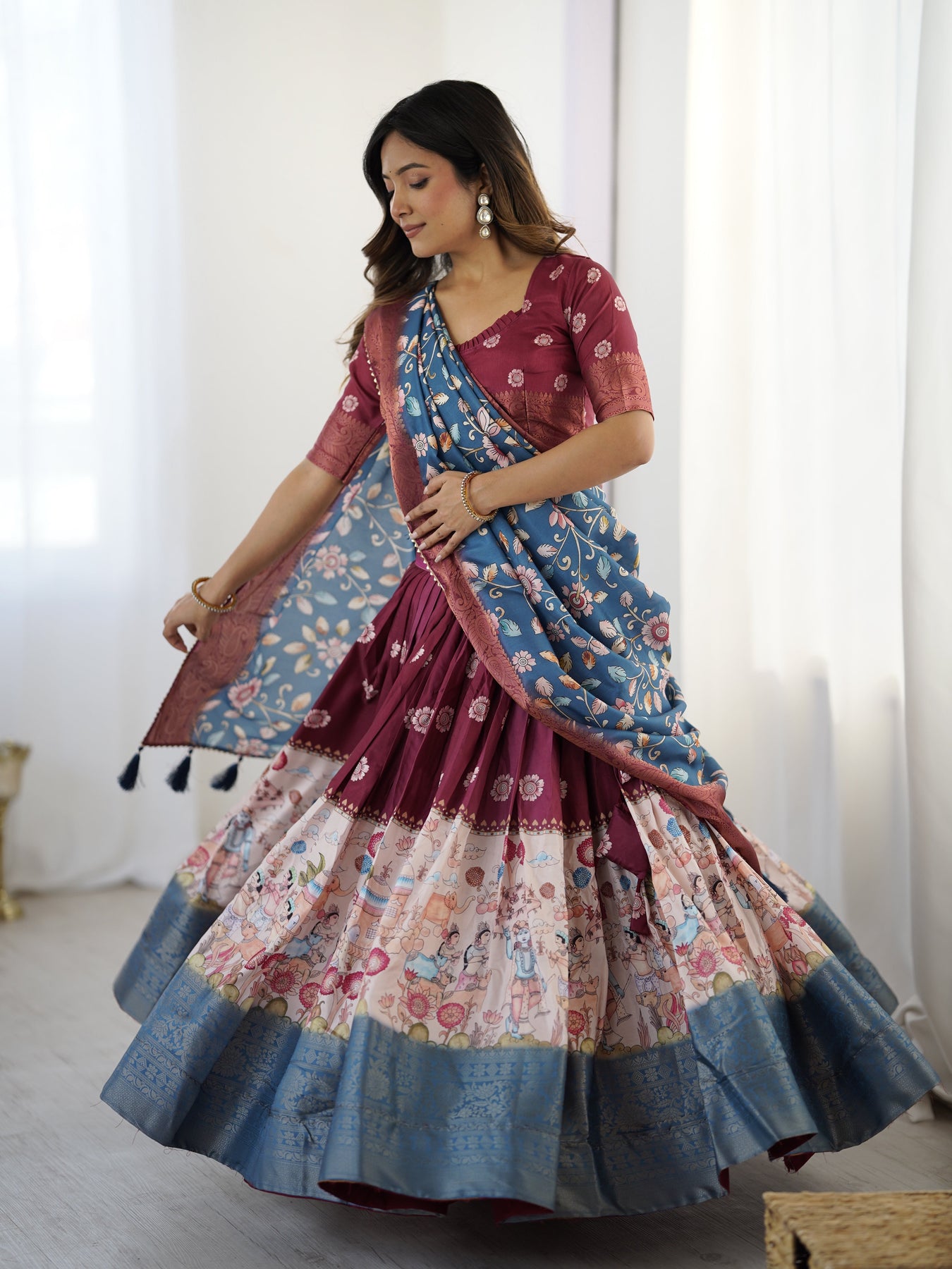 Drape yourself in the elegance of heritage with this Wine Maroon Kalamkari Flared Lehenga, perfectly complemented by a stunning blue floral dupatta. Crafted with intricate kalamkari digital prints and zari woven borders, this ensemble embodies the grace of Indian tradition in a modern, wearable form.