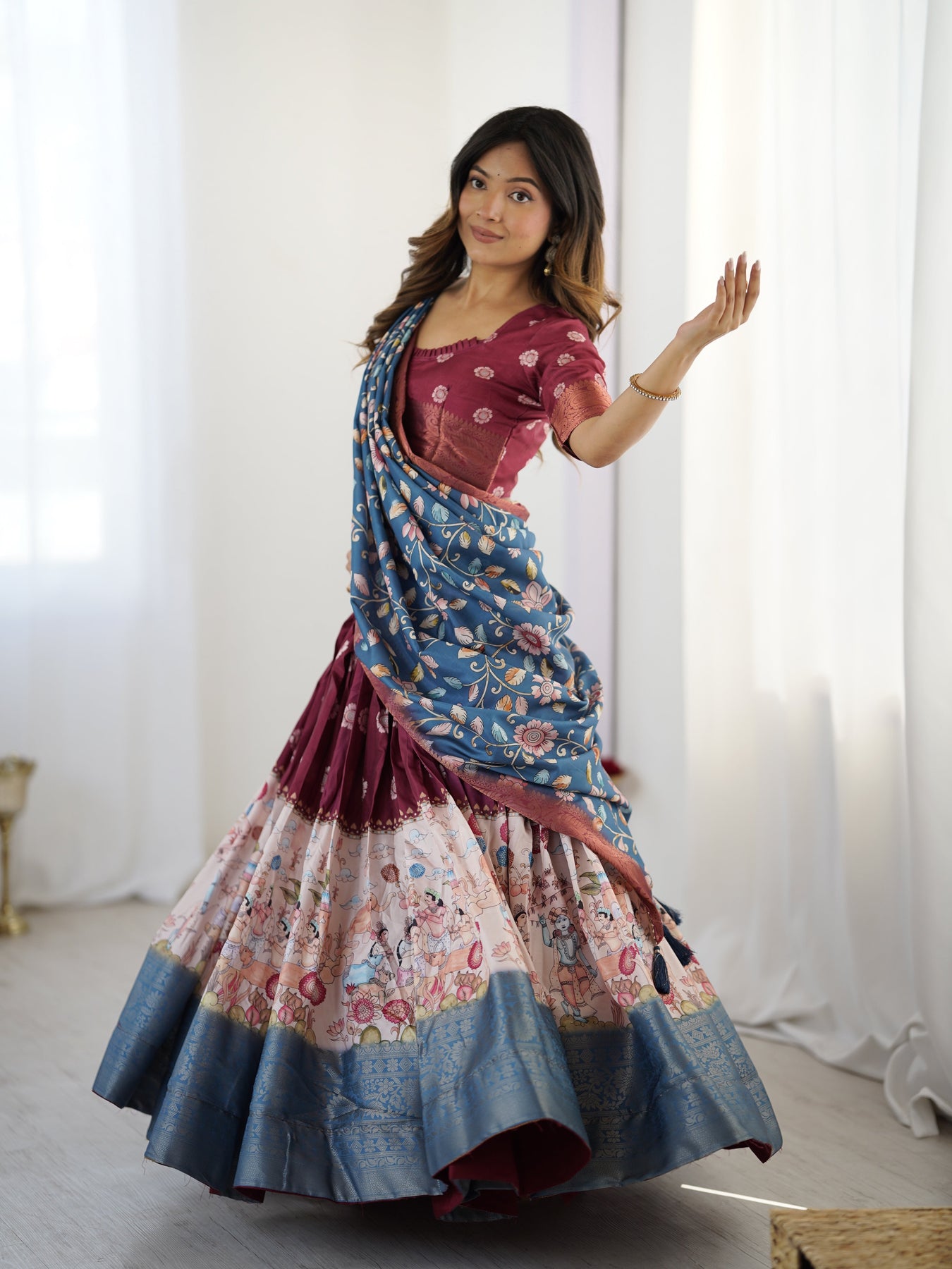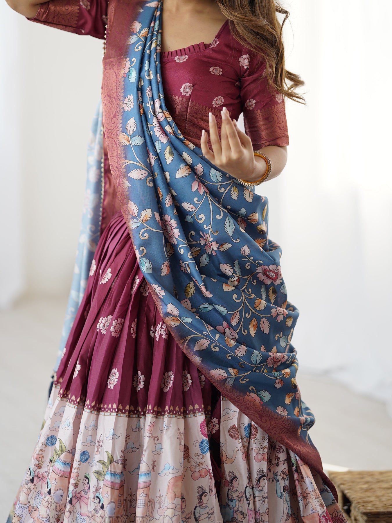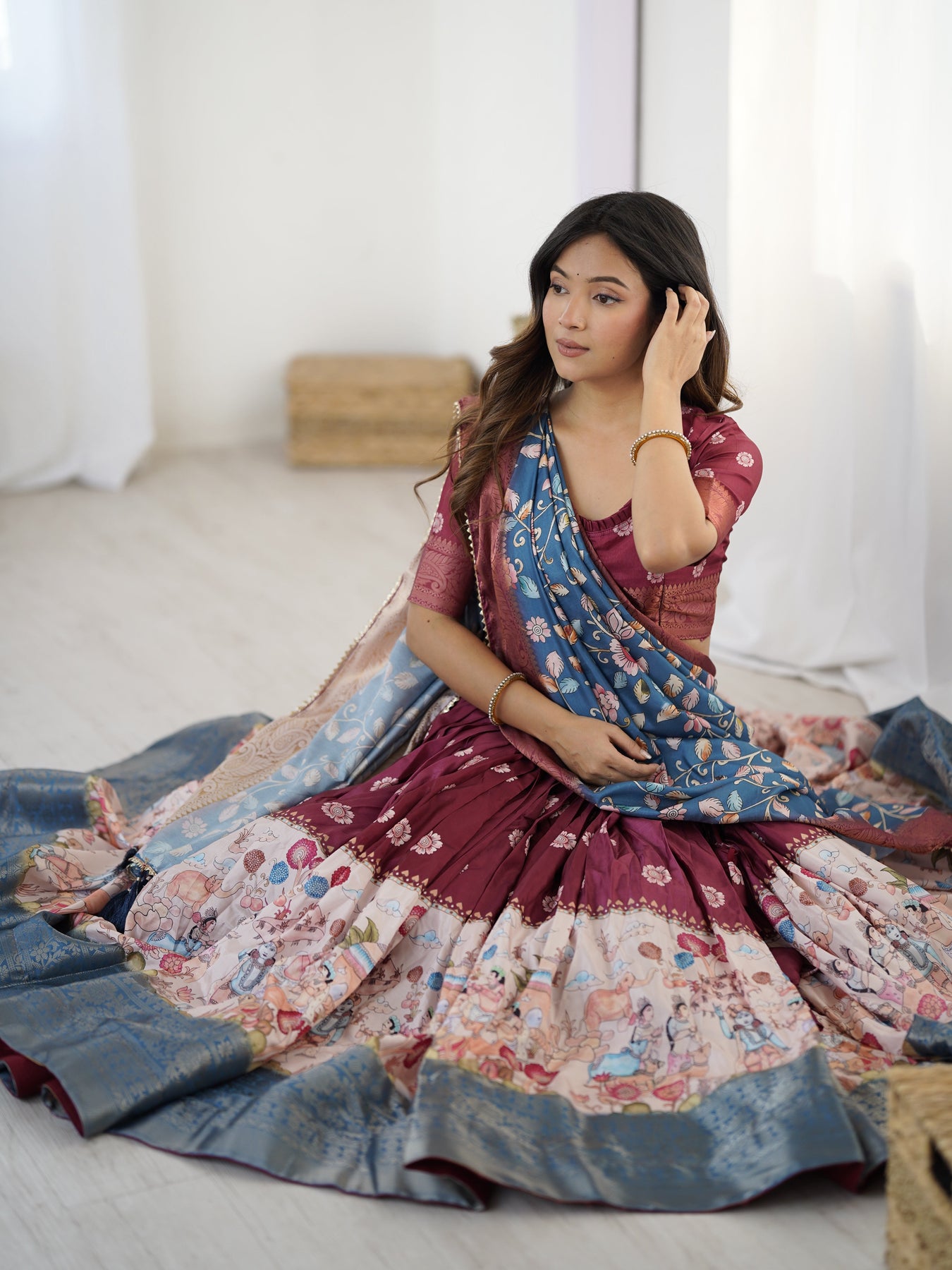 The rich wine maroon tone paired with the calm blue dupatta strikes the perfect balance of boldness and elegance. The kalamkari scenes add cultural depth, while the floral weave elevates the overall richness — making it a standout piece for any grand occasion.