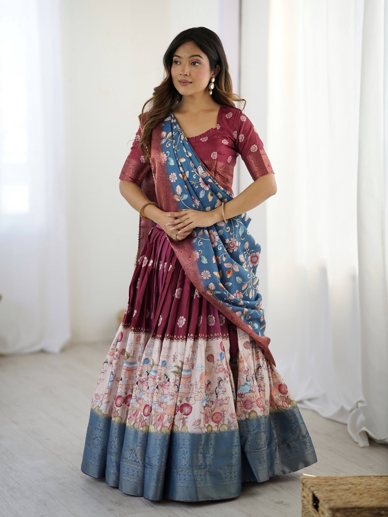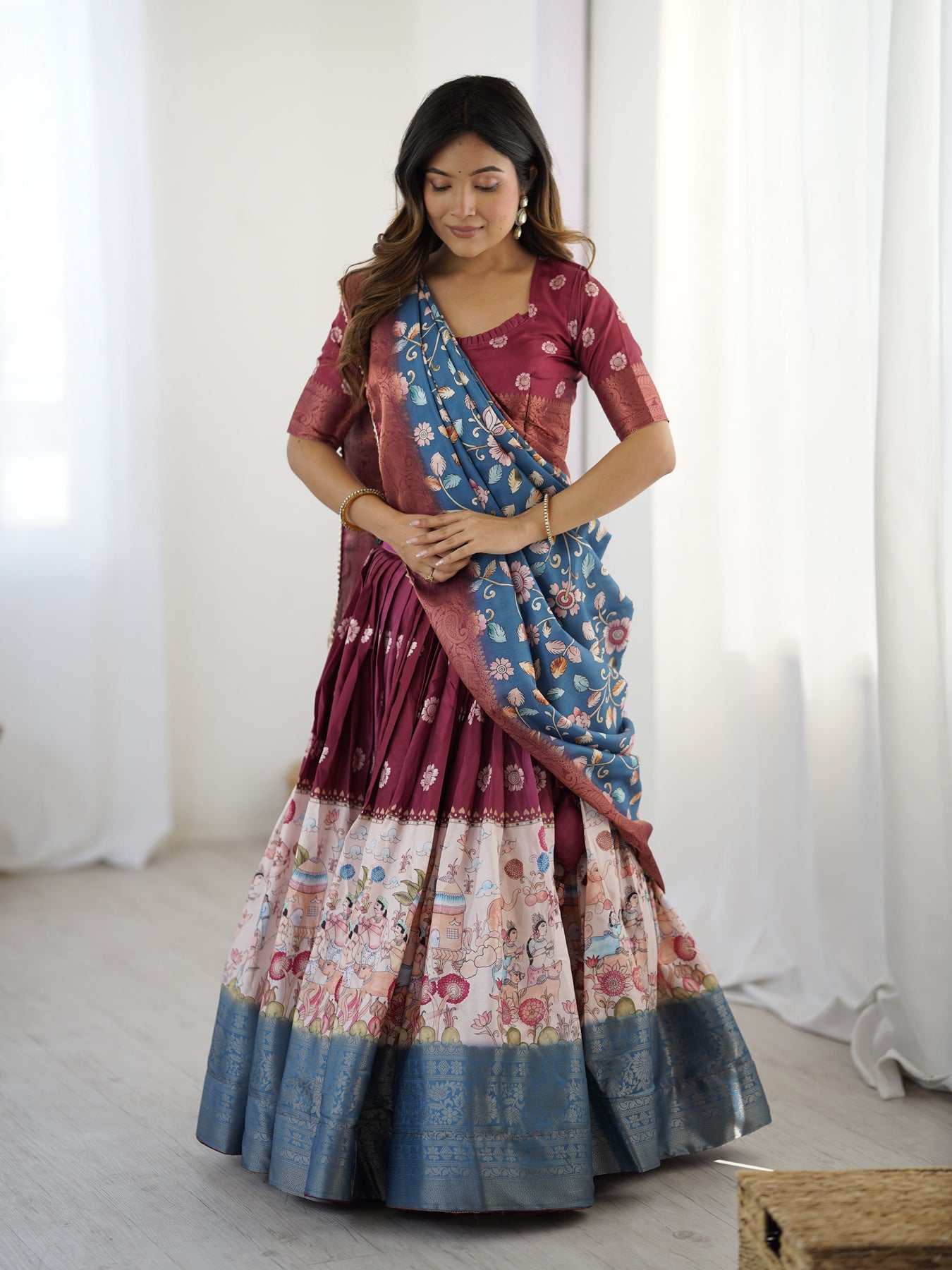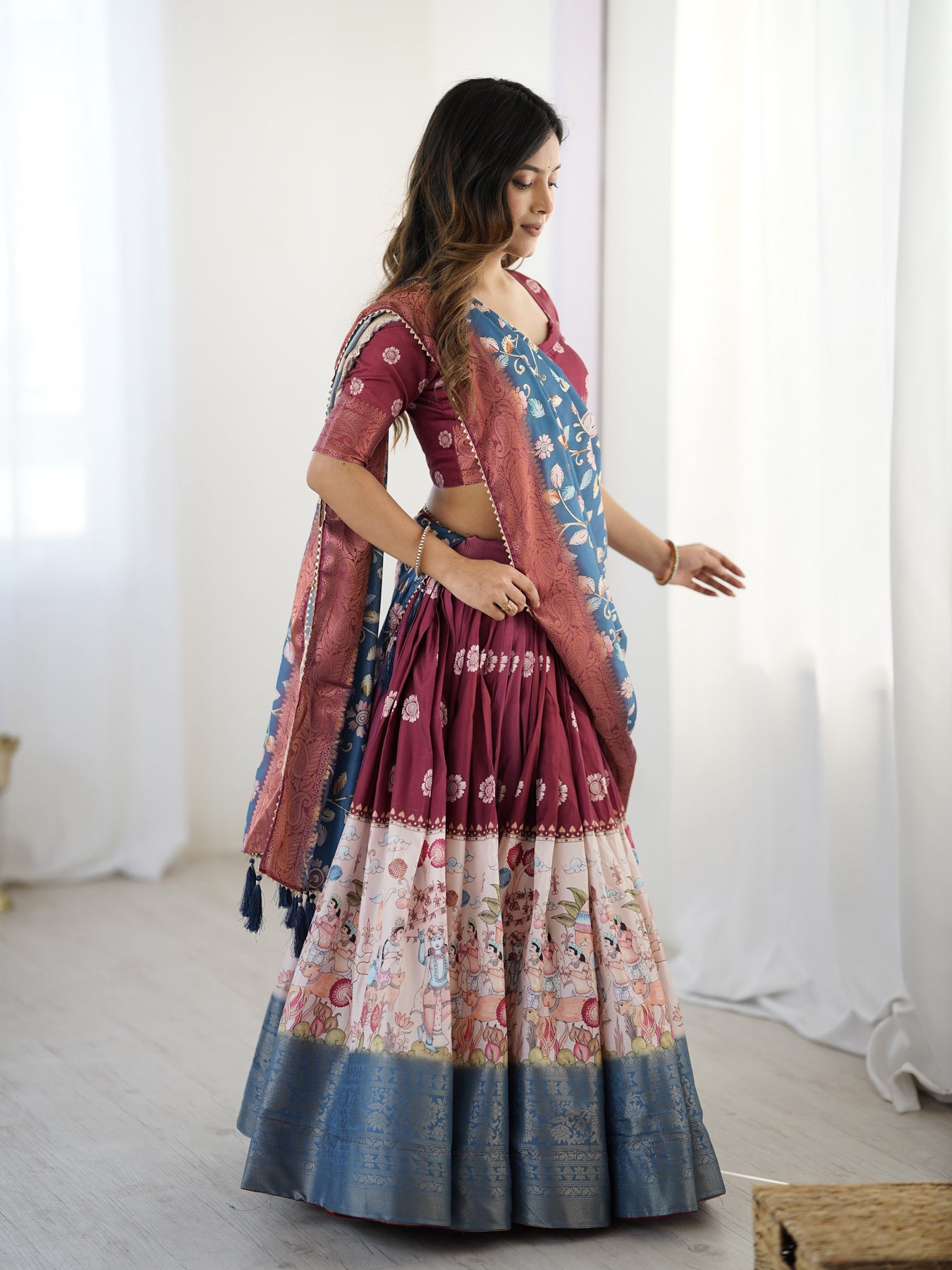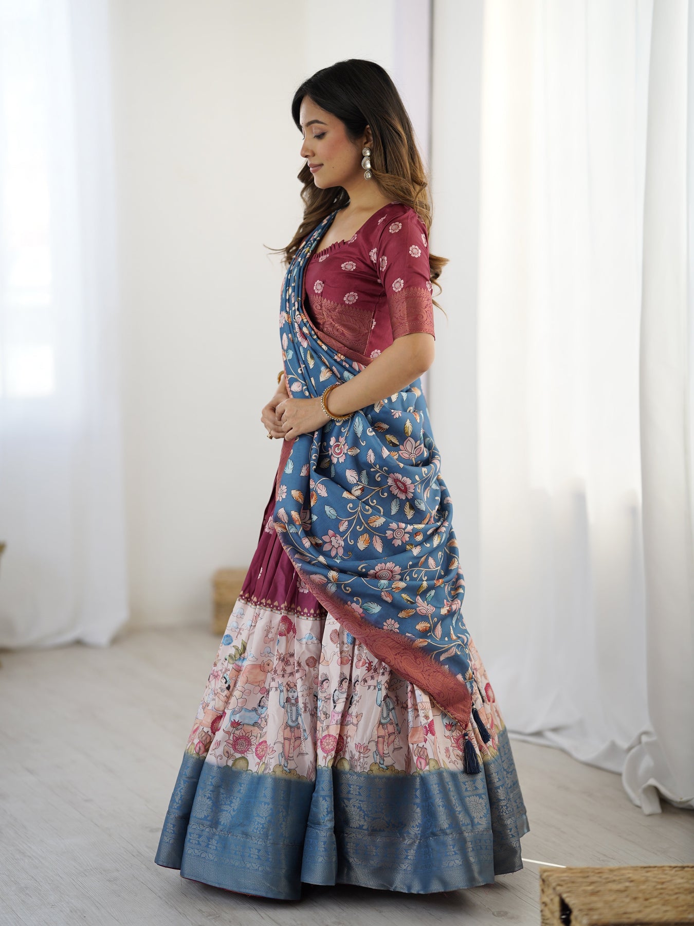 The rich wine maroon tone paired with the calm blue dupatta strikes the perfect balance of boldness and elegance. The kalamkari scenes add cultural depth, while the floral weave elevates the overall richness — making it a standout piece for any grand occasion.