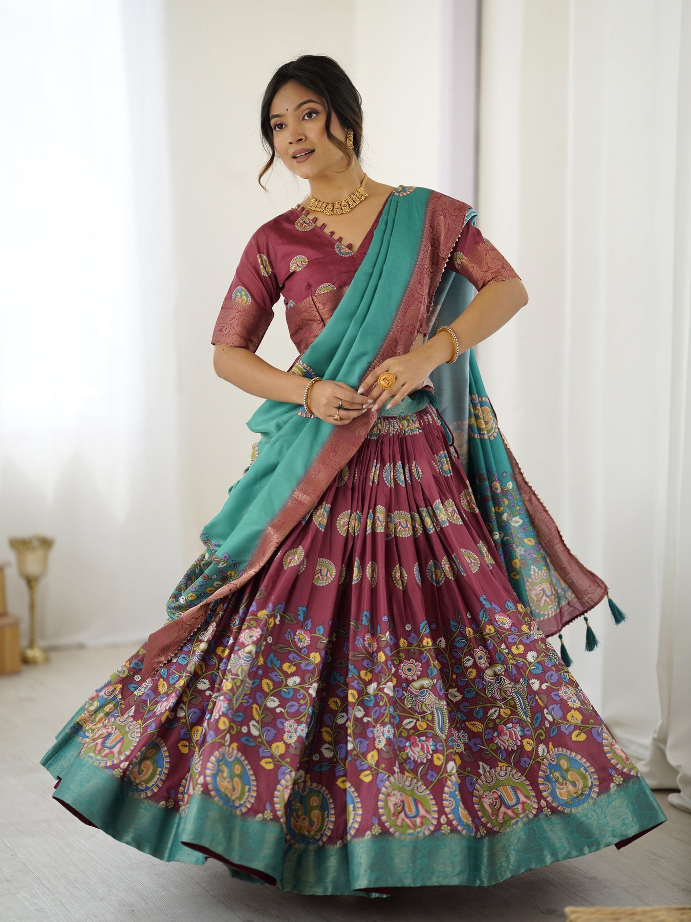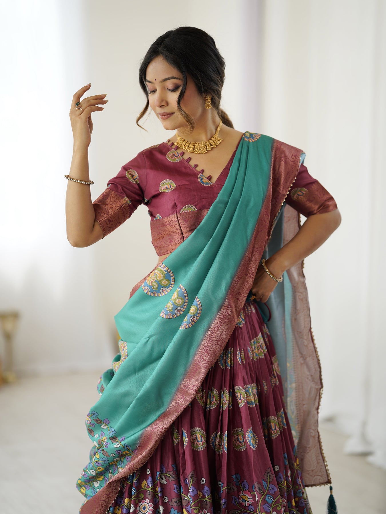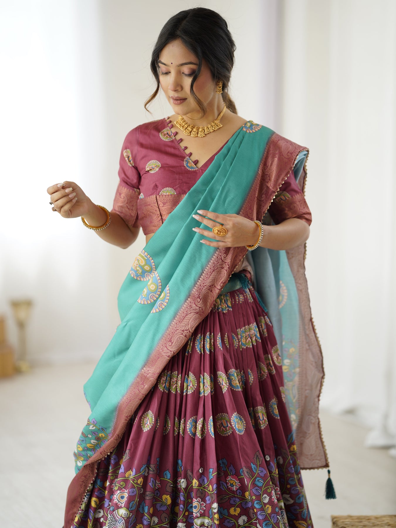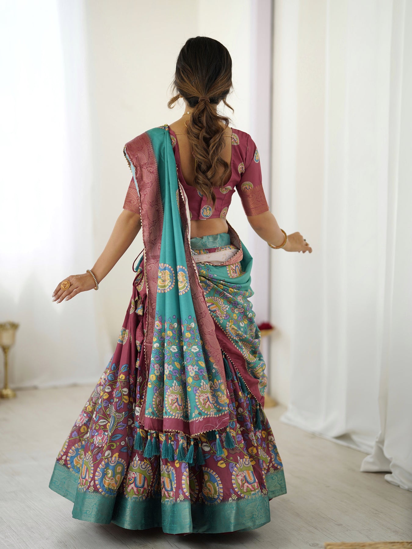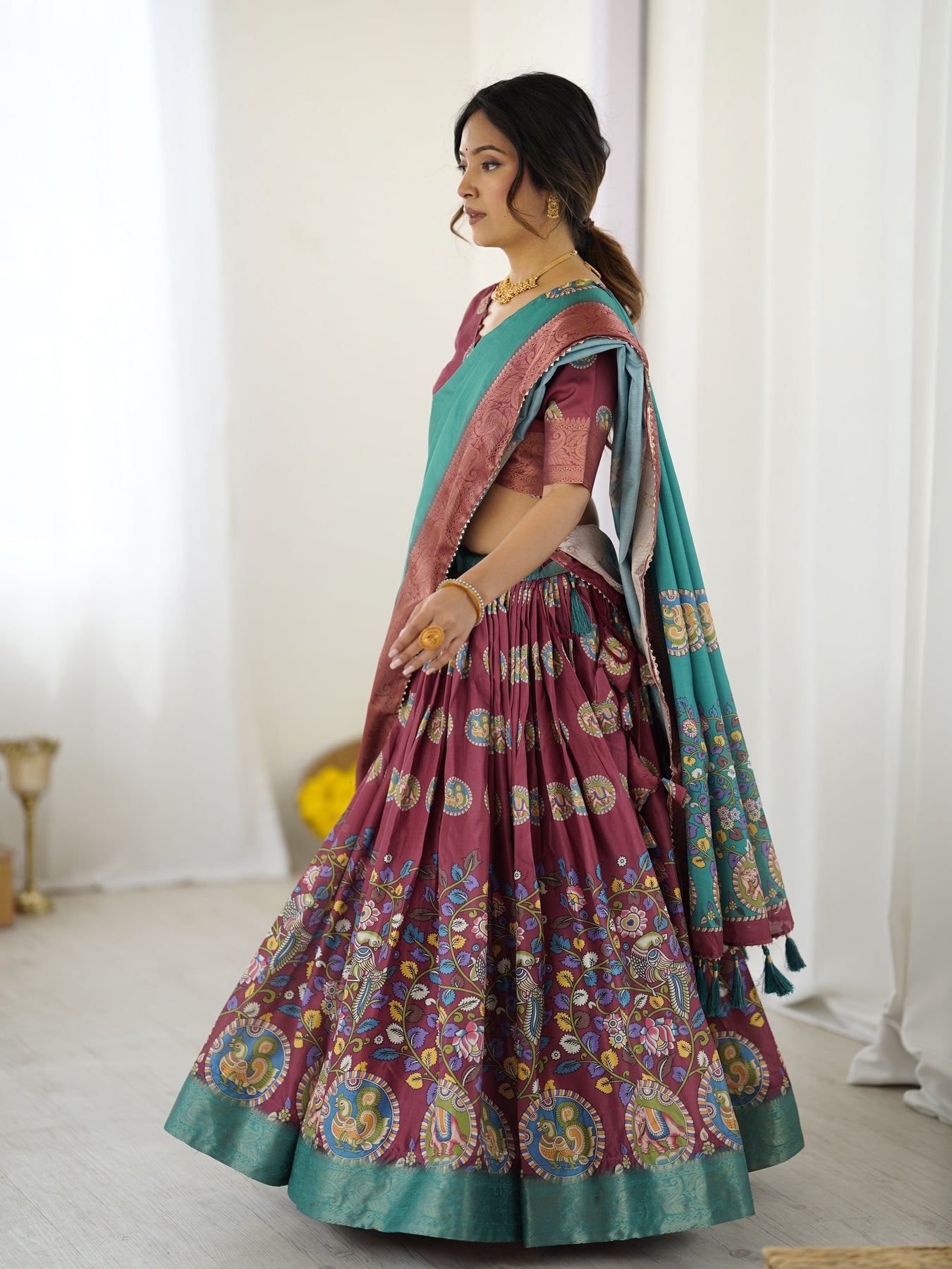 This Wine & Teal Kalamkari Tussar Silk Lehenga is a masterpiece of heritage artistry and festive elegance. Designed with intricate Kalamkari patterns, a rich zari border, and a tassel-detailed dupatta on both sides, it exudes royal charm. Perfect for weddings, Navratri nights, and grand celebrations. Includes an unstitched blouse for a perfect custom fit.