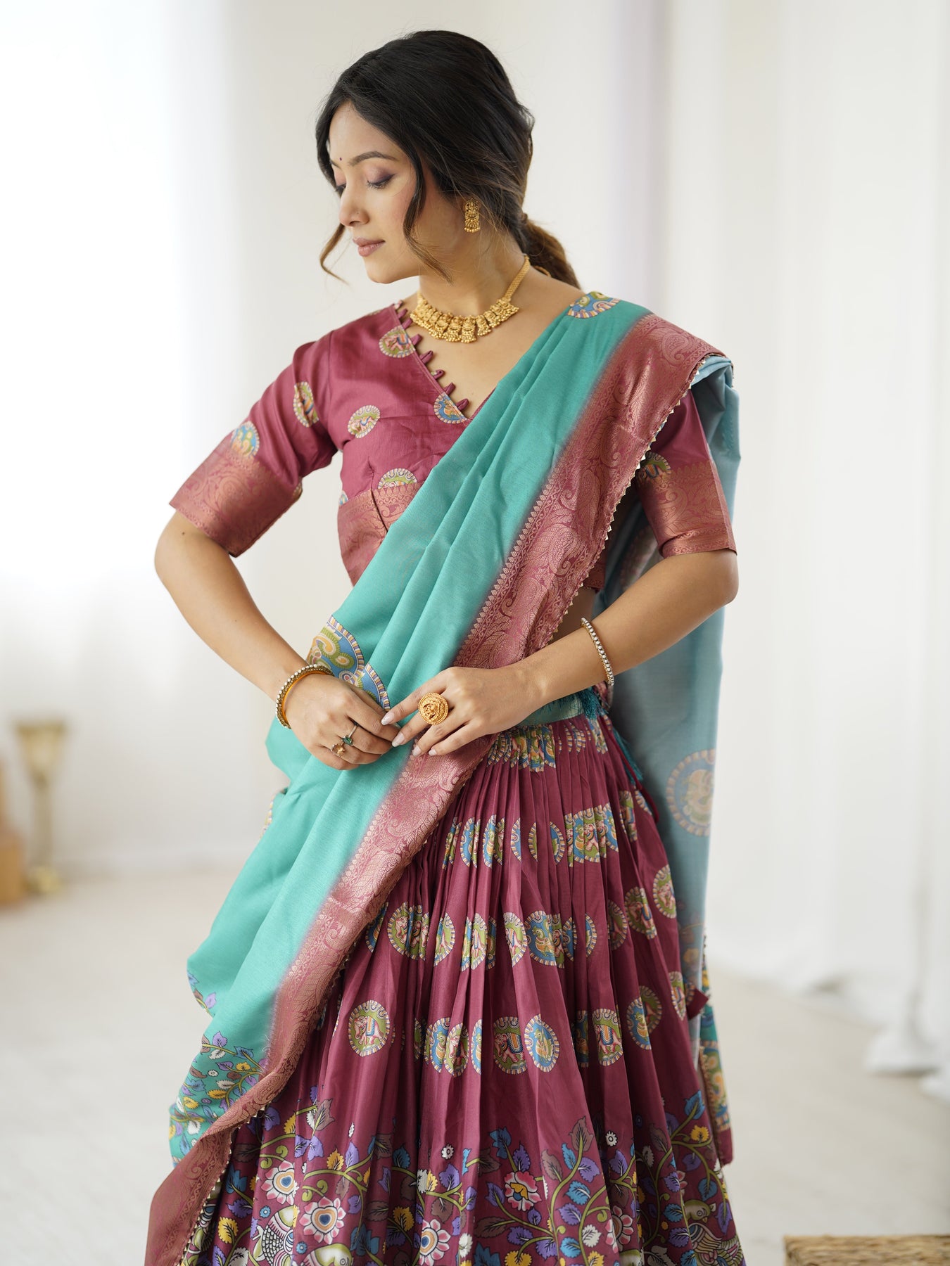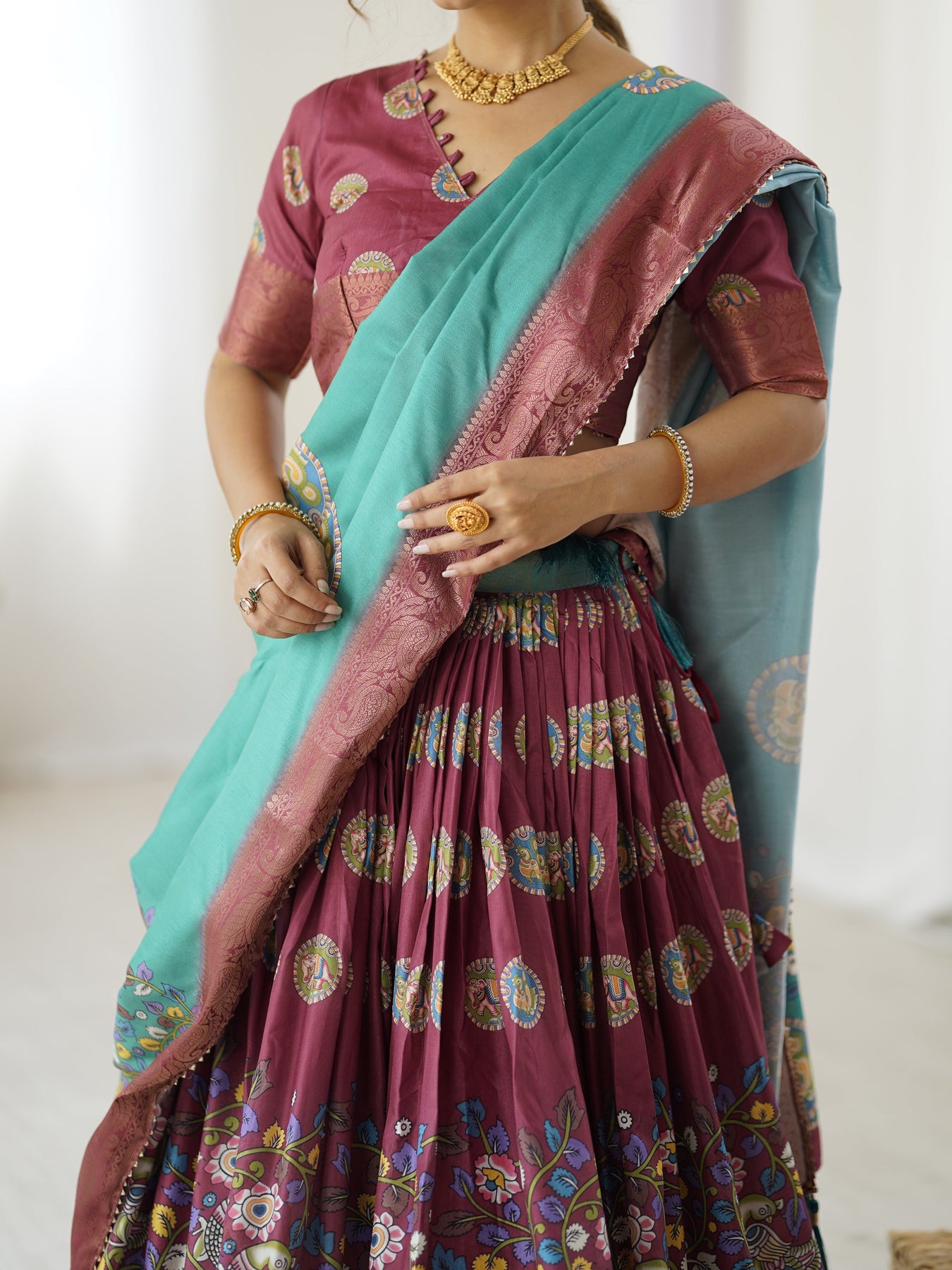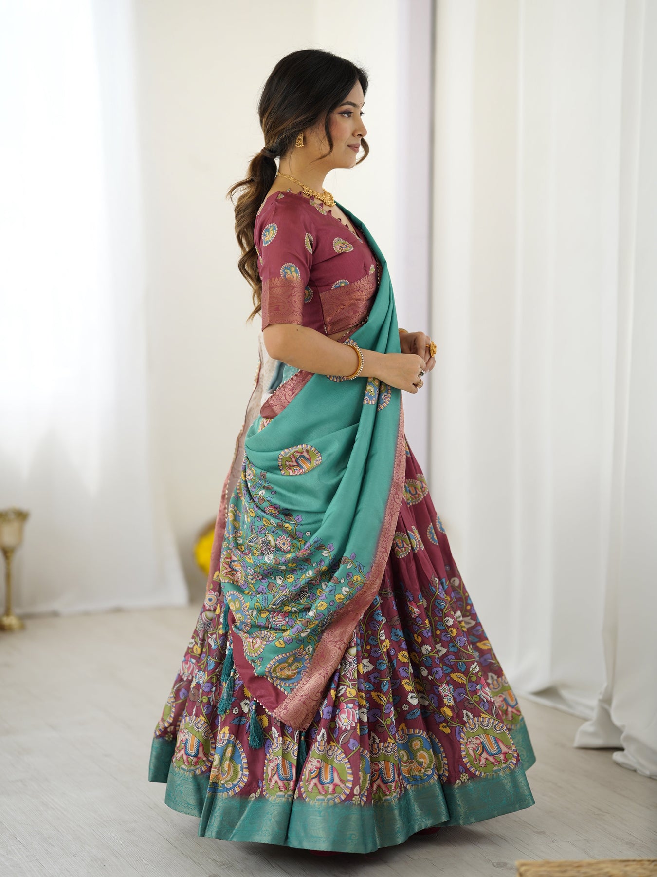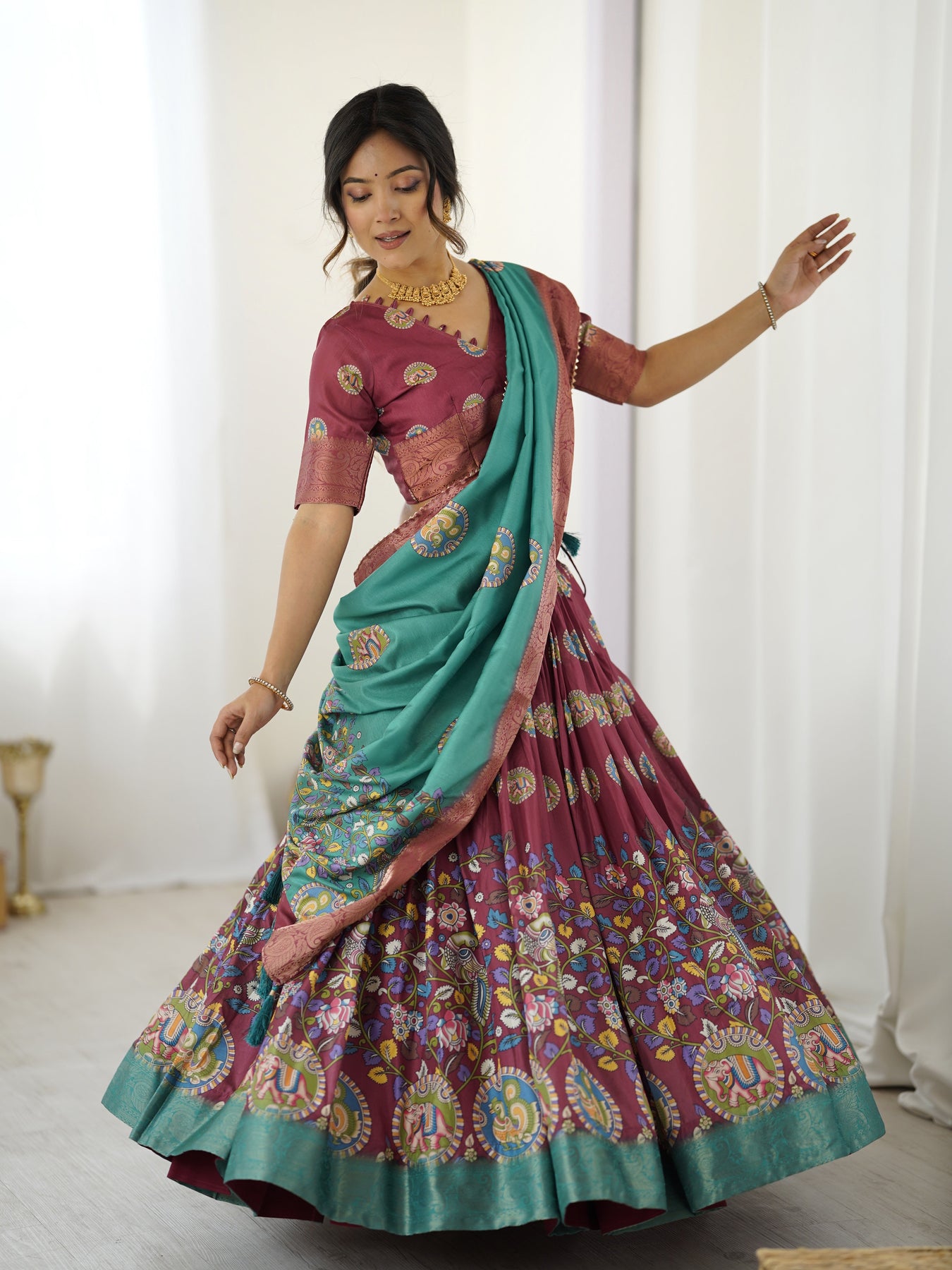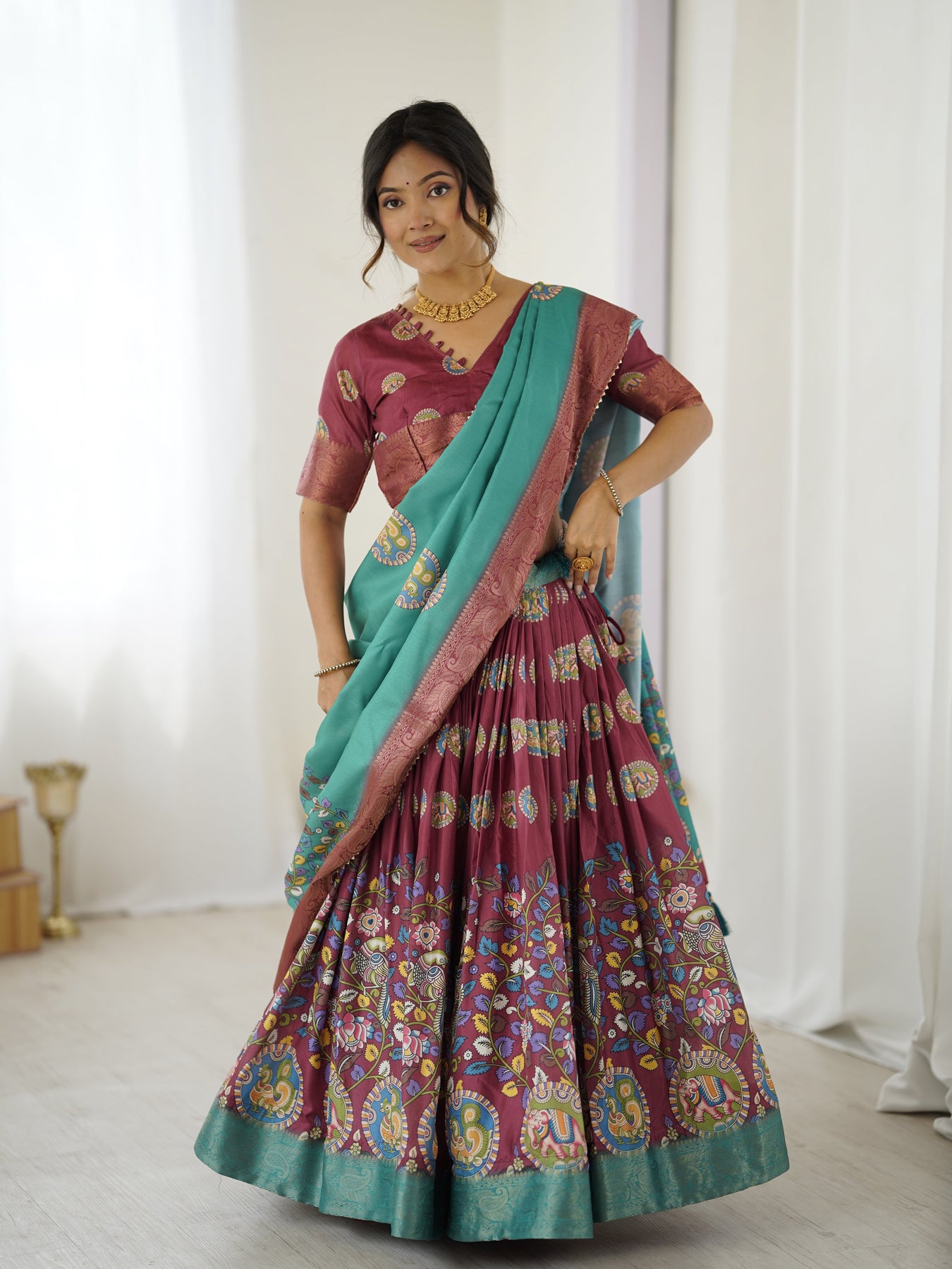 This Wine & Teal Kalamkari Tussar Silk Lehenga is a masterpiece of heritage artistry and festive elegance. Designed with intricate Kalamkari patterns, a rich zari border, and a tassel-detailed dupatta on both sides, it exudes royal charm. Perfect for weddings, Navratri nights, and grand celebrations. Includes an unstitched blouse for a perfect custom fit.